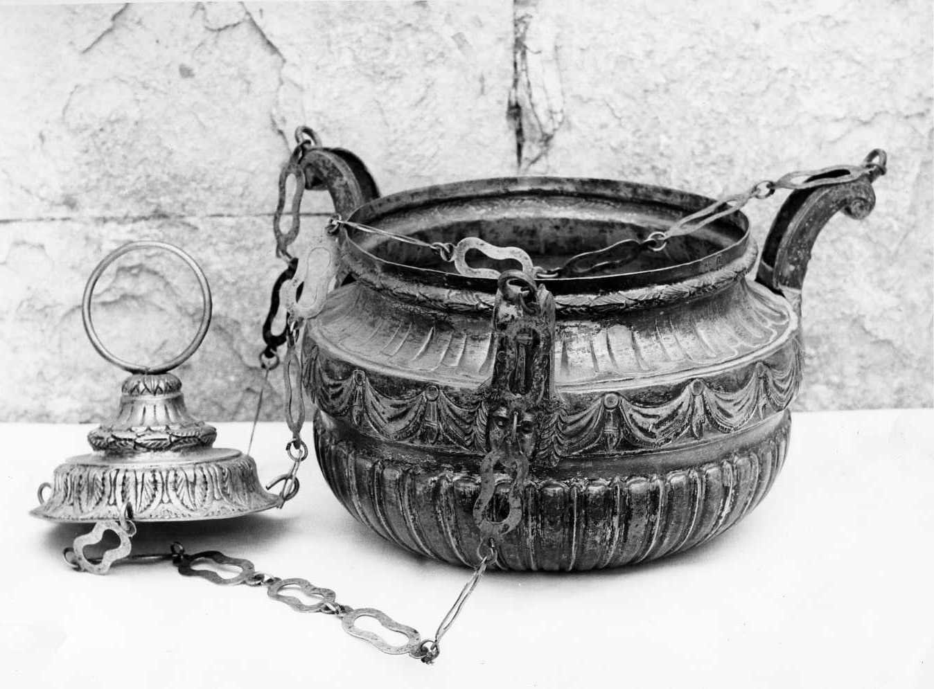 - NOTIZIE STORICO CRITICHE La decorazione propone il repertorio usuale ottocentesco di sapore neoclassico, con baccellature lunghe e il motivo dei festoni. Una datazione al quarto decennio del secolo XIX è proponibile sulla base dei bolli, quello dell'arte, decretato nel 1832 e modificato 1839, e quello dell'argentiere, scarsamente leggibile ma forse appartenente a Gabriele Sisino, patentato maestro nel 183 (cfr. E. e C. CATELLO, Argenti... Napoli 1973, pp. 110 e 151)