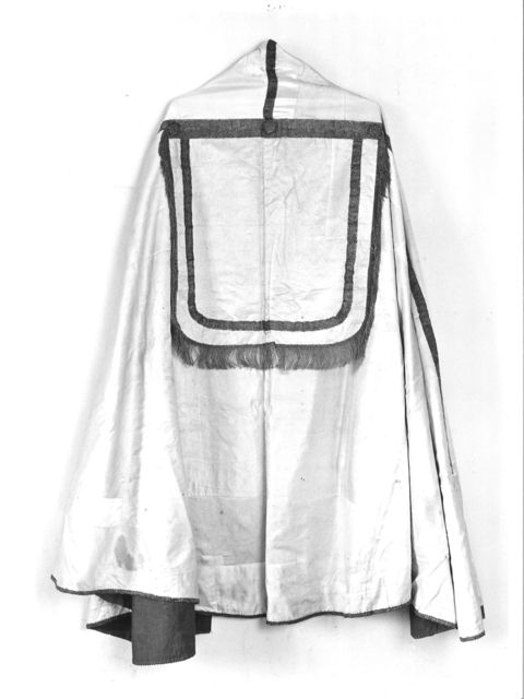piviale in seta bianca, galloni in filo d'argento avvolto attorno ad un filo arancio