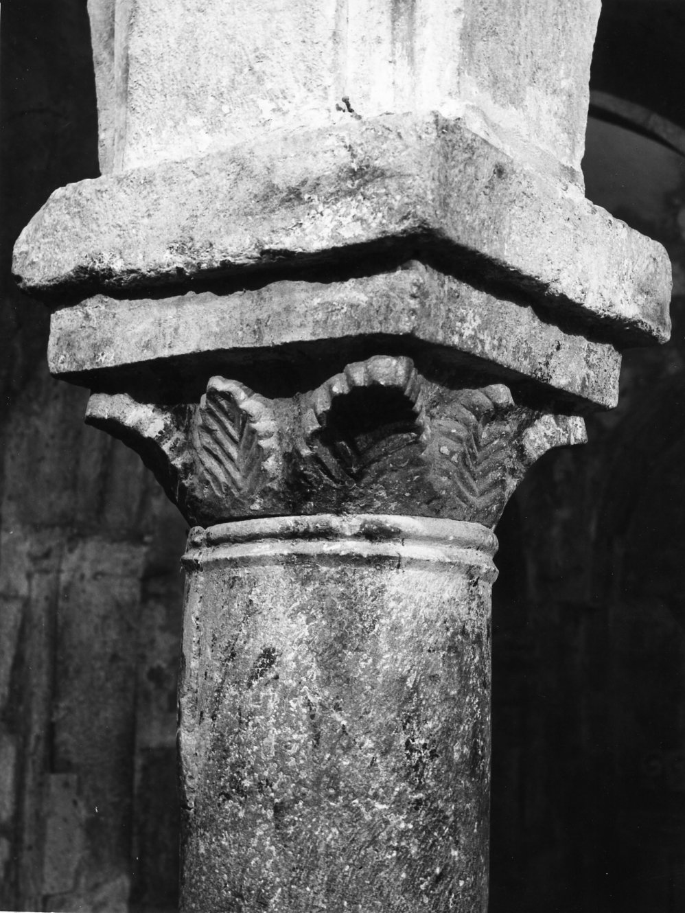 Capitello decorato con foglie accartocciate e nervate, poggiante su un abaco quadrangolare