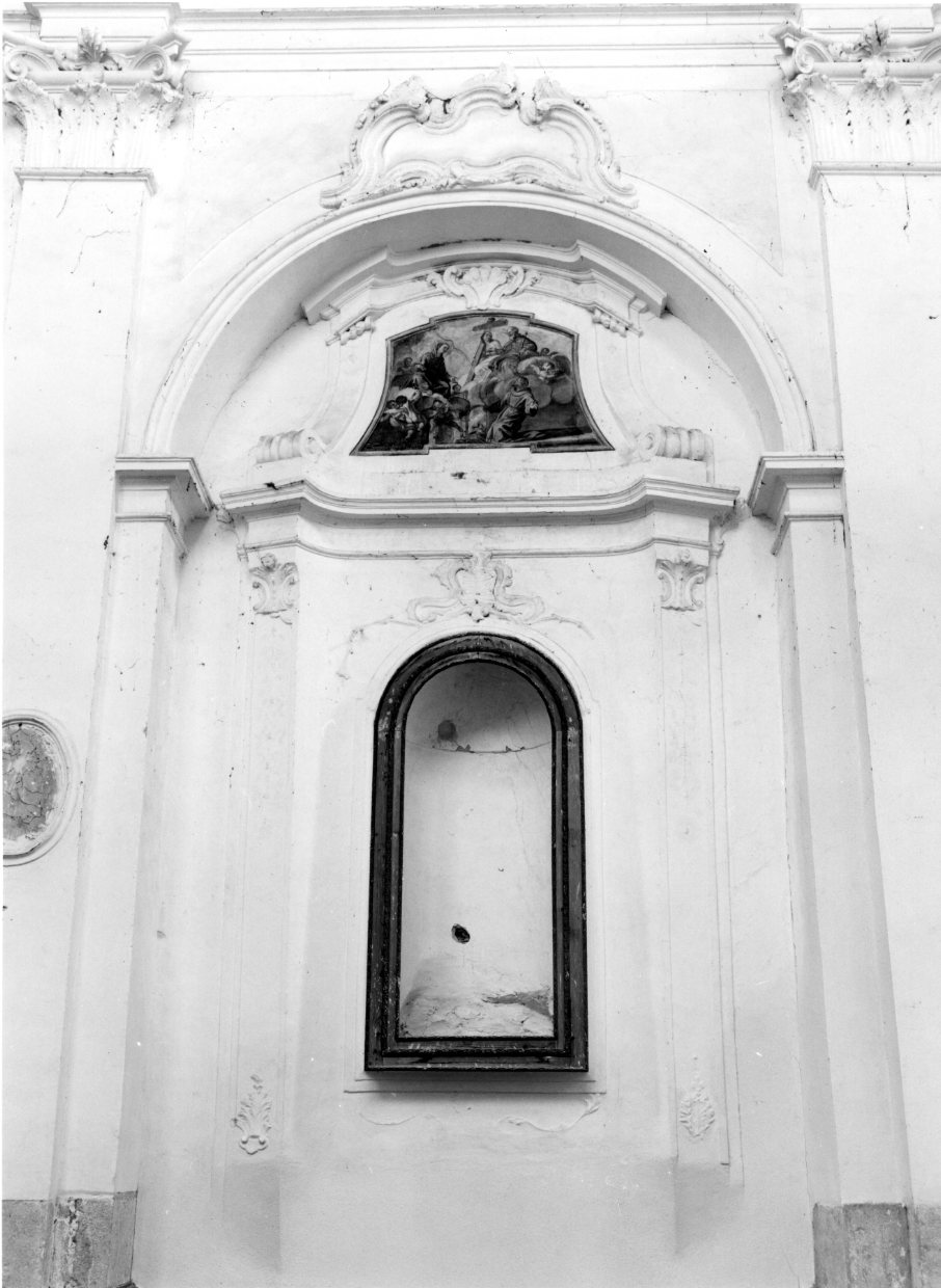 pilastro con cornici modanate convesse decorate a volute; fastigio con decorazioni a volute e paraste inquadranti un dipinto; sopra l'arco tabella decorata a volute