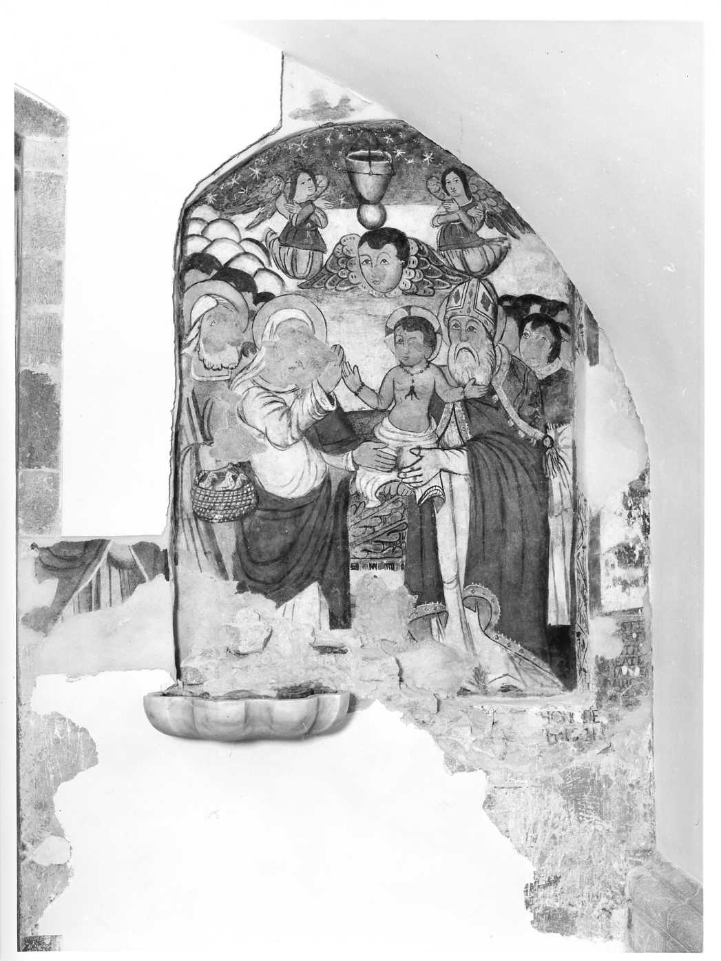 - NOTIZIE STORICO CRITICHE In origine l'affresco doveva ricoprire una superficie più vasta di quella attuale, come dimostra la presenza del frammento e l'iscrizione al di fuor i della nicchia. L'opera, databile in base all'iscrizione al quinto decen nio del XVI secolo, è stata eseguita da un ignoto pittore attardato e prov inciale. La mediocrità dell'autore è evidente nell'incapacità di rendere a lcuni particolari anatomici, ad esempio le mani, nella rigidezza dei gesti e nelle incertezze compositive