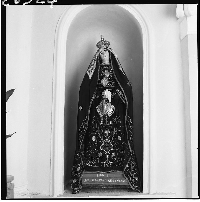 Personaggi: Madonna Addolorata. Attributi: (Madonna Addolorata) cuore trafitto da sette spade