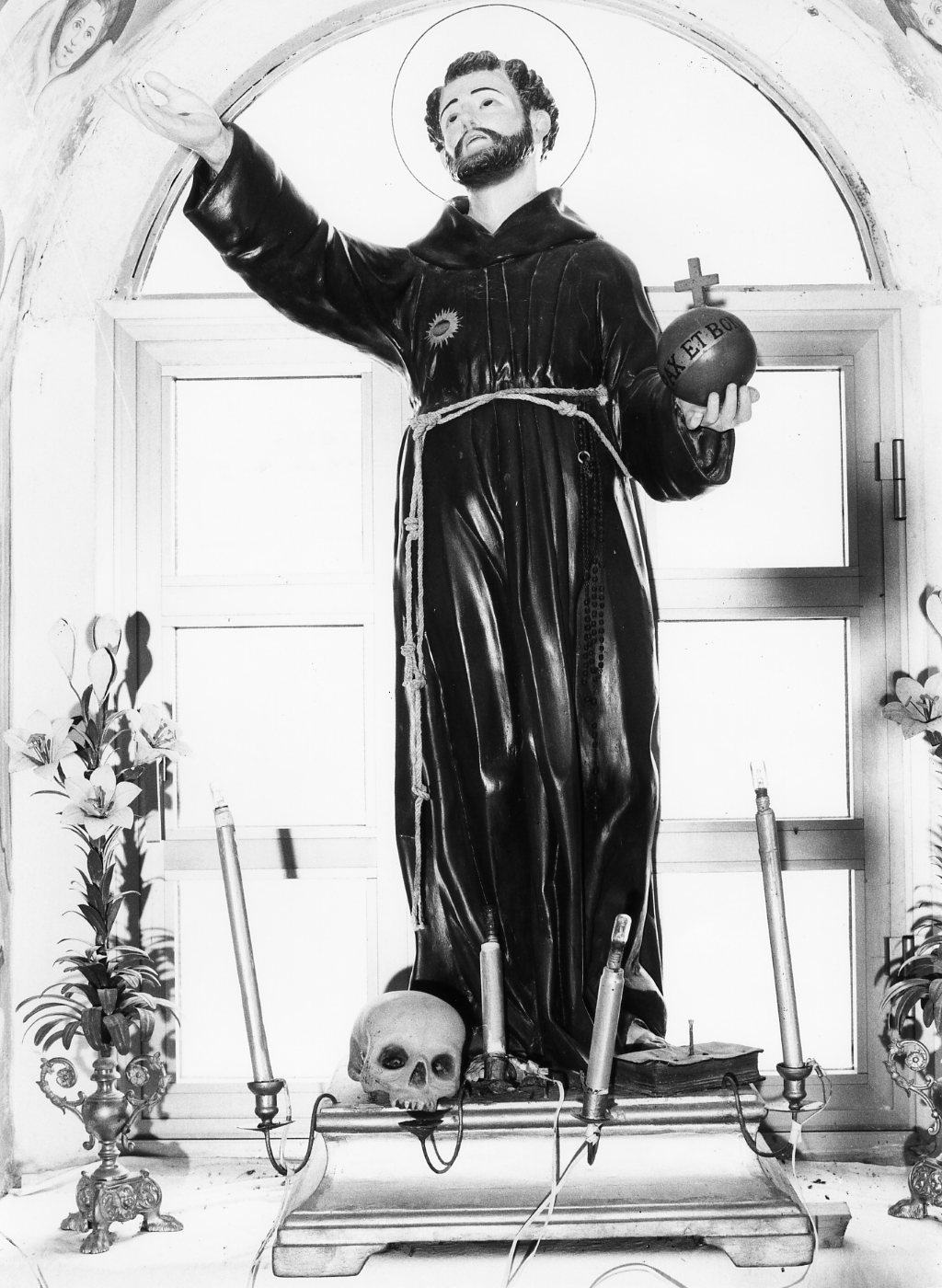 Personaggi: San Francesco d'Assisi. Attributi: (San Francesco d'Assisi) teschio; sfera sormontata da croce. Abbigliamento religioso: (San Francesco d'Assisi) saio