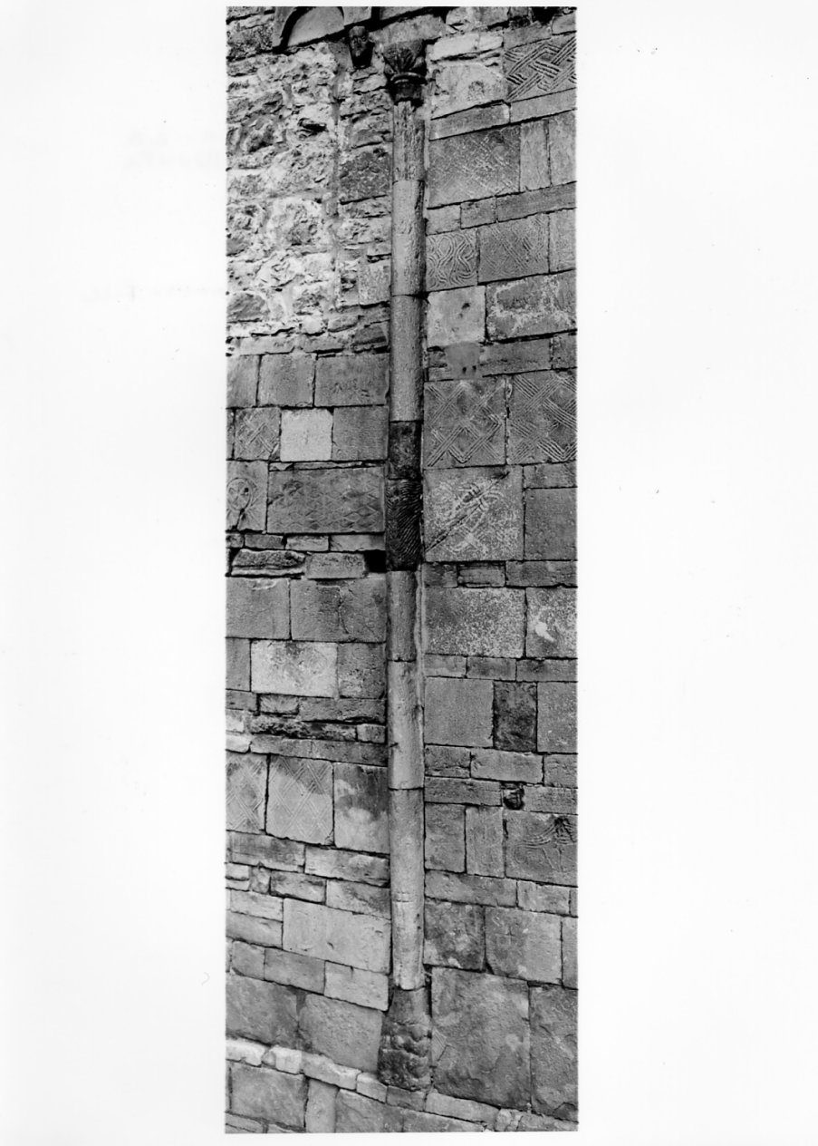 - NOTIZIE STORICO CRITICHE La colonnina è composta di più elementi di reimpiego, provenienti da una precedente costruzione e rimontati in questo punto senza un criterio strutturale né un preciso riferimento all'originaria funzione. Di difficile datazione, come gli altri pezzi inglobati nella muratura, potrebbe risalire ai secoli X/XI, ossia al periodo in cui fu edificata (o riedificata, di preciso non sappiamo) la chiesa che ebbe da Papa Leone IX il riconoscimento del privilegio della Porta Santa