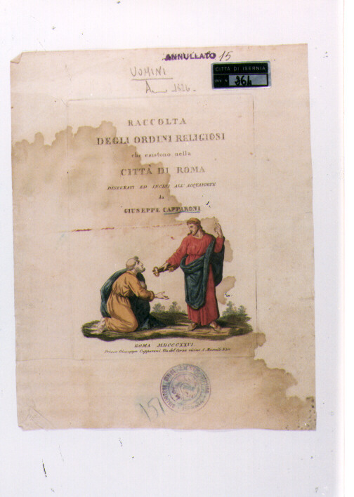 - ISCRIZIONI IN BASSO - ROMA MDCCCXXVI/ PRESSO GIUSEPPE CAPPARONI. VIA DEL CORSO VICINO S. MARCELLO N.311 - lettere capitali/ corsivo -