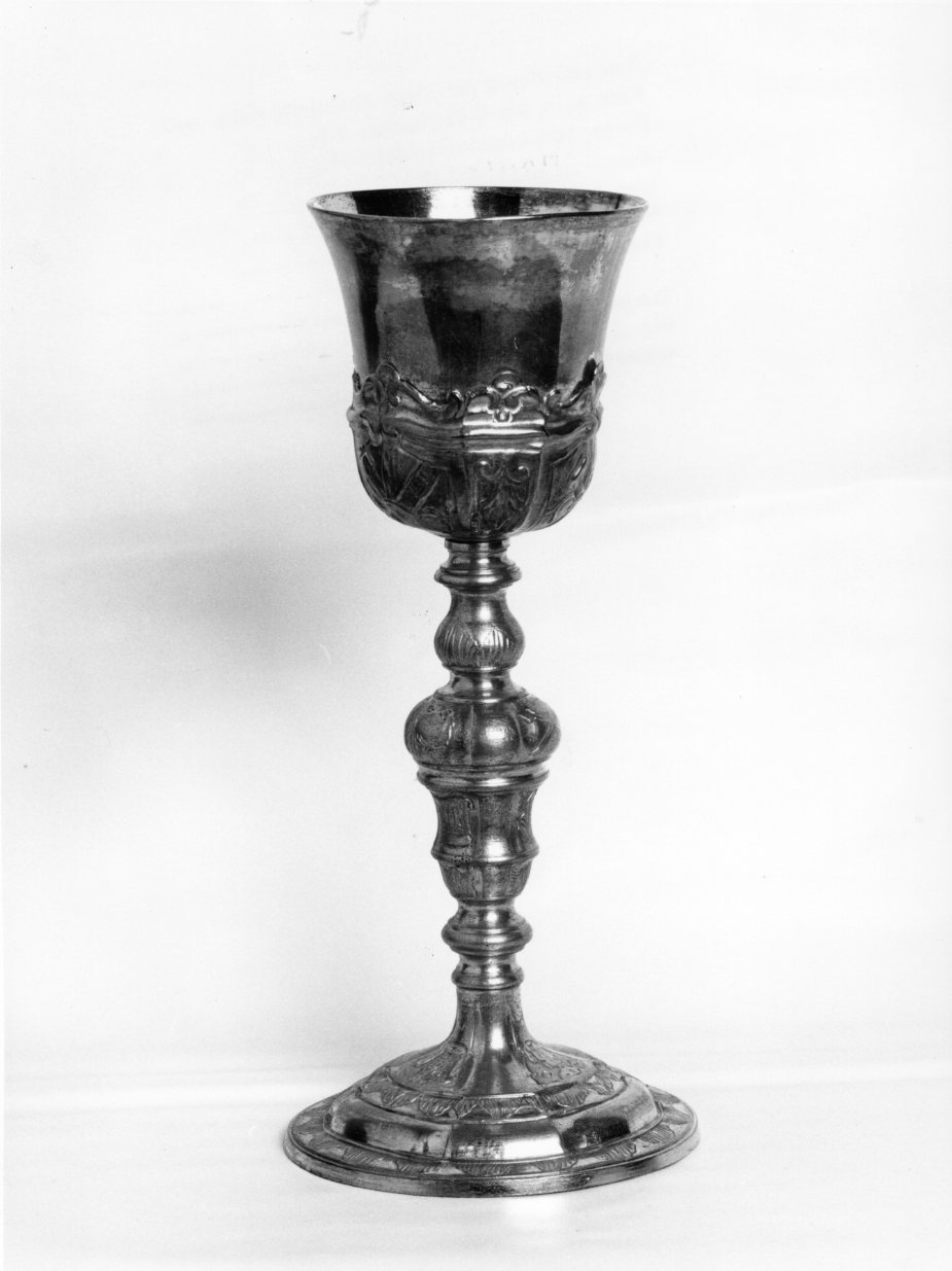 Calice decorato con simboli della Passione di Cristo ripartiti come segue. Piede: scala con due lance, volto di Cristo coronato di spine, veste. Nodo: INRI ( su cartiglio), corni incrociati, lance. Parte superiore del nodo: corona di spine, lance incrociate, scala. Vaso: martello e scala, freccia e corno, croce con lacci