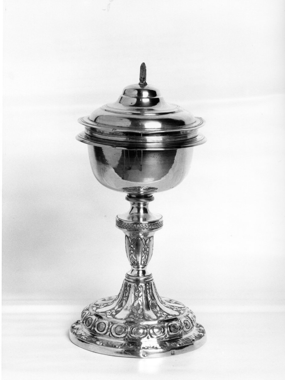 Bordo del piede decorato con doppio motivo circolare concentrico; fusto con decorazioni floreali e a foglia; vaso e coperchi lisci