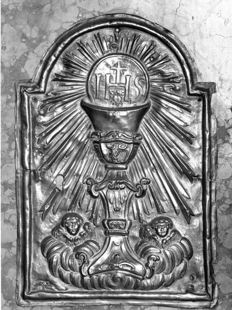 Sportello raffigurante il trionfo dell'Eucarestia: calice da cui sporge un'ostia raggiata con la scritta IHS con croce sommitale sull'H e sotto il Sacro Cuore. Sul vaso del calice un grappolo d'uva. Ai lati del piede, tra nubi, due teste cherubiche