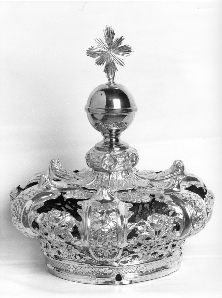 Corona a lavorazione traforata e sbalzata in cui parti piene con motivi a rosette si alternano a gruppi di tre rose. Globo liscio con croce sommitale