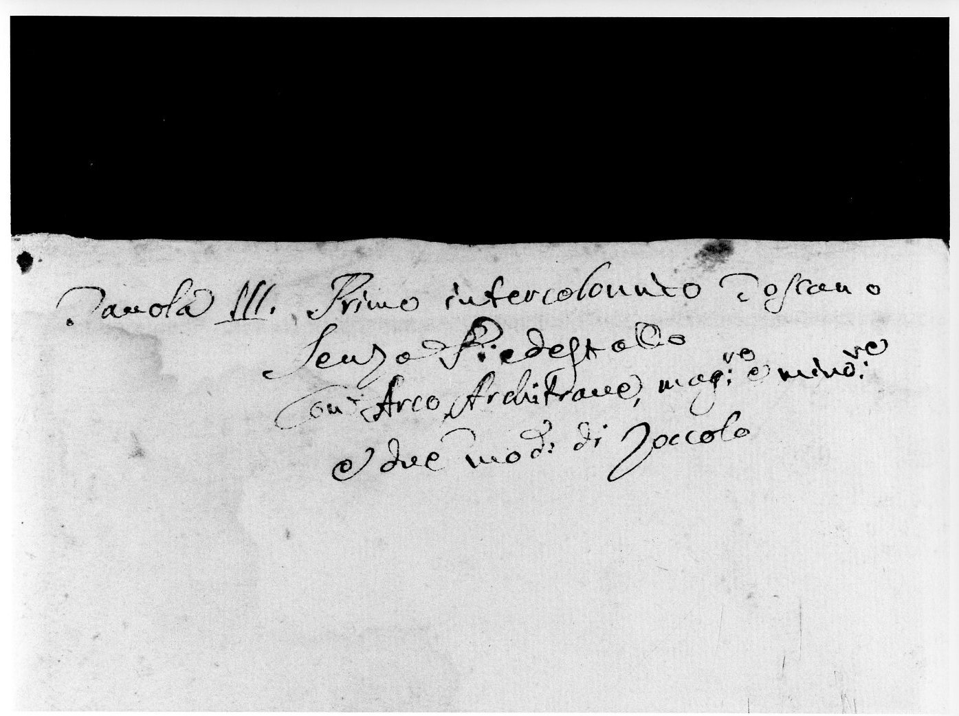 - ISCRIZIONI verso, in alto a sinistra - Tavola III Primo intercolonio Toscano/ senza Piedistallo/ con Arco Architrave mag.re med.no:/ e due mod: di zoccolo - corsivo - a penna -
