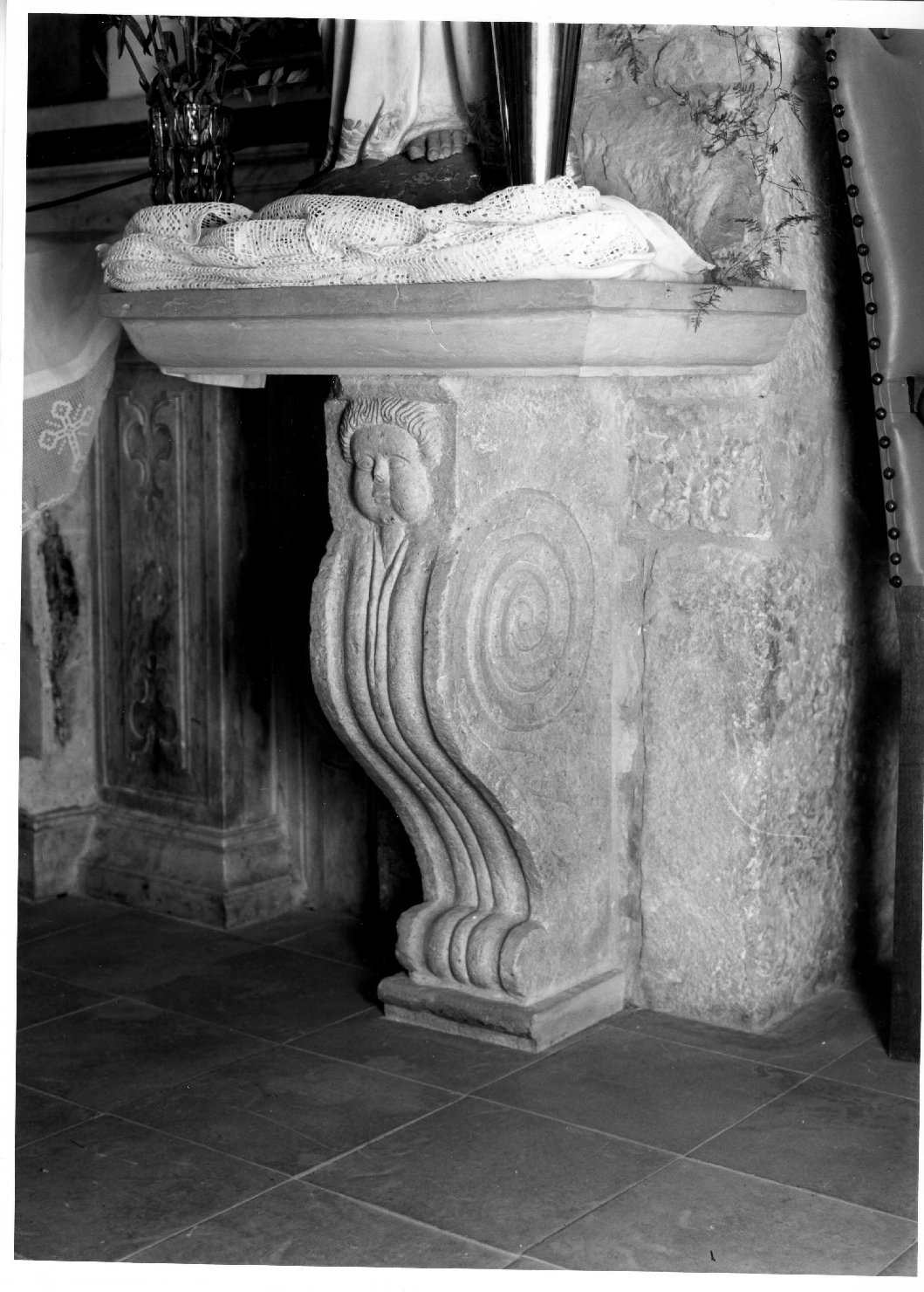 - NOTIZIE STORICO CRITICHE La mensola, con piano non pertinente, è stata recuperata sotto il pavimento della chiesa. La presenza della testina scolpita e il senso plastico delle volute suggeriscono una datazione al XVII secolo, anche se non è da escludersi l'impiego di tali modi stilistici nel secolo successivo