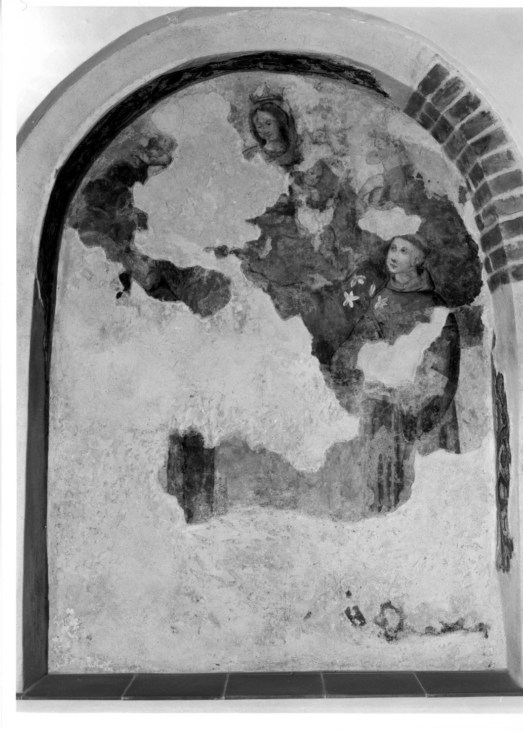- NOTIZIE STORICO CRITICHE L'opera di difficile lettura per le ampie lacune, presenta una fattura esecutiva che ne denuncia lo stile provinciale e la chiara ispirazione alle composizioni di pittura devozionale di Benedetto Brunetti. La permanenza di caratteri tardo-cinquecenteschi non esclude il protrarsi fino al XIX secolo di sigle stilistiche e di modelli che in ambito locale avevano raggiunto in passato apprezzabili livelli qualitativi. La medesima ispirazione è riscontrabile nel fregio e negli intrecci vegetali del sott'arco