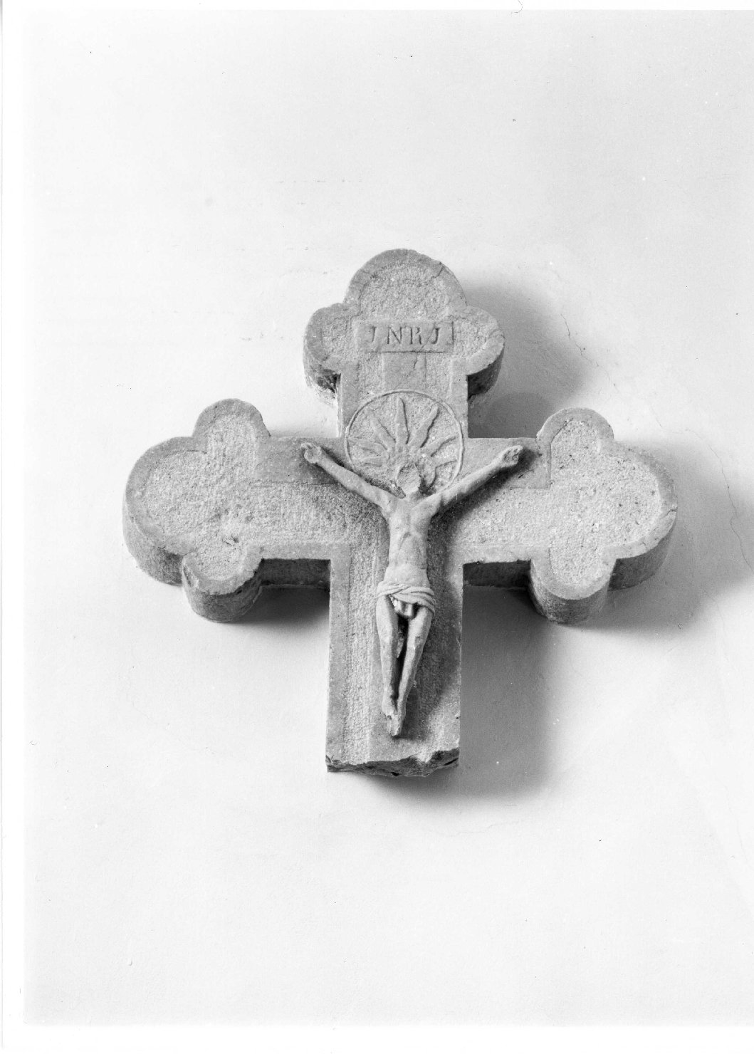 Croce viaria con bracci a terminazioni trilobate. Crocifisso con aureola a raggiera lanceolata