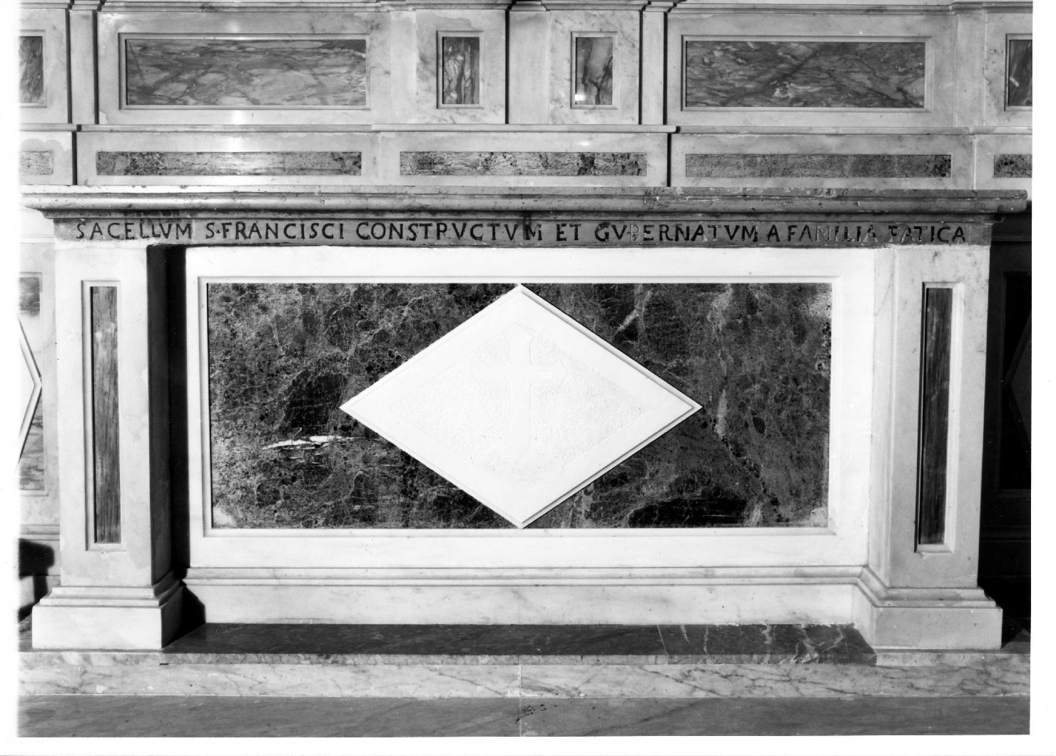 - NOTIZIE STORICO CRITICHE La mensa ricomposta sull'altare di fattura recente, è l'unica parte del distrutto altare consacrato nel 1726, data riportata dalla lapide adiacente (scheda NCTN 1400072642). L'altare è citato come già esistente nel 1728 insieme a un quadro negli inventari di tutti i luoghi pii della terradell'Oratino (Arch. Parr; Com. Or. di D. Gentile Lorusso). La costruzione della cappella di San Francesco, come recita l'iscrizione sul bordo, fu finanziata dalla famiglia Fatica, che dovette provvedere a corredare l'altare anche di un busto ligneo del Santo