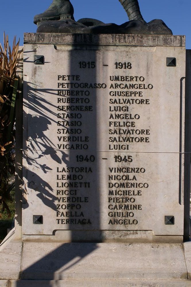 Monumento ai caduti. Il basamento ospita le lapidi marmoree commemorarive e una fascia bronzea sul prospetto principale