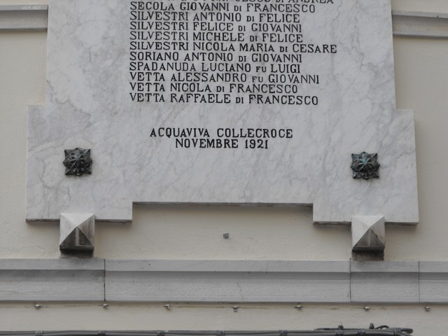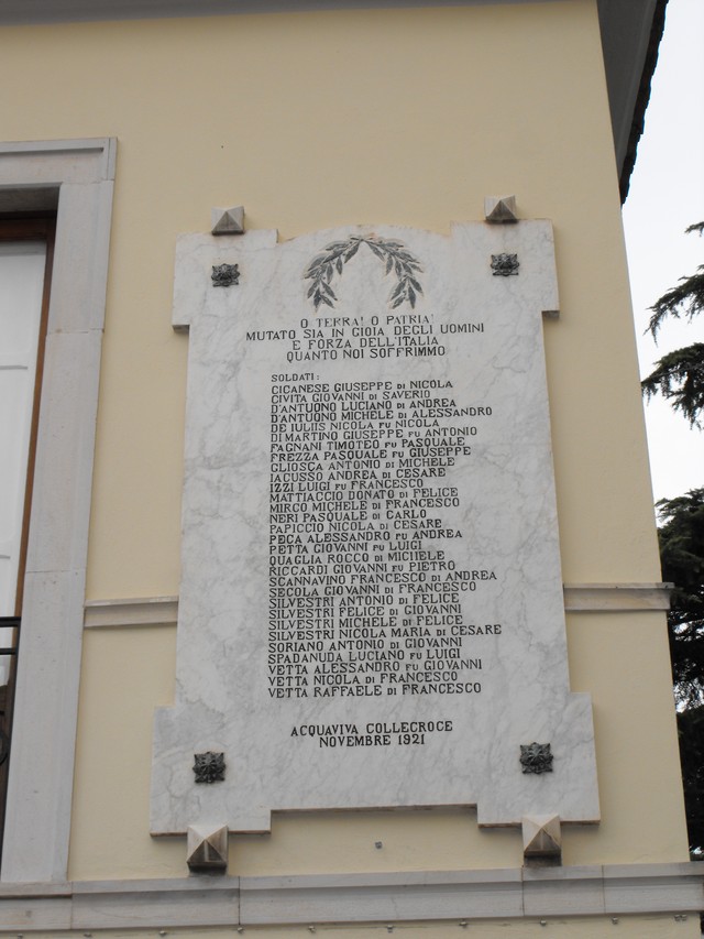 - ISCRIZIONI centrale giustificata a sinistra - O TERRA! O PATRIA!/ MUTATO SIA IN GIOIA DEGLI UOMINI/ E FORZA DELL’ITALIA/ QUANTO NOI SOFFRIMMO/ SOLDATI:/ CICANESE GIUSEPPE DI NICOLA/ CIVITA GIOVANNI DI SAVERIO/ D’ANTUONO LUCIANO DI ANDREA/ D’ANTUONO MICHELE DI ALESSANDRO/ DE IULIIS NICOLA FU NICOLA/ DI MARTINO GIUSEPPE FU ANTONIO/ FAGNANI TIMOTEO FU PASQUALE/ FREZZA PASQUALE FU GIUSEPPE/ GLIOSCA ANTONIO DI MICHELE/ IACUSSO ANDREA DI CESARE/ IZZI LUIGI FU FRANCESCO/ MATTIACCIO DONATO DI FELICE/ MIRCO MICHELE DI FRANCESCO/ NERI PASQUALE DI CARLO/ PAPICCIO NICOLA DI CESARE/ PECA ALESSANDRO FU ANDREA/ PETTA GIOVANNI FU LUIGI/ QUAGLIA ROCCO DI MICHELE/ RICCARDI GIOVANNI FU PIETRO/ SCANNAVINO FRANCESCO DI ANDREA/ SECOLA GIOVANNI DI FRANCESCO/ SILVESTRI ANTONIO DI FELICE/ SILVESTRI FELICE DI GIOVANNI/ SILVESTRI MICHELE DI FELICE/ SILVESTRI NICOLA MARIA DI CESARE/ SORIANO ANTONIO DI GIOVANNI/ SPADANUDA LUCIANO FU LUIGI/ VETTA ALESSANDRO FU GIOVANNI/ VETTA NICOLA DI FRANCESCO/ VETTA RAFFAELE DI FRANCESCO/ ACQUAVIVA COLLECROCE NOVEMBRE 1921 - capitale alto-basso - a incisione - italiano