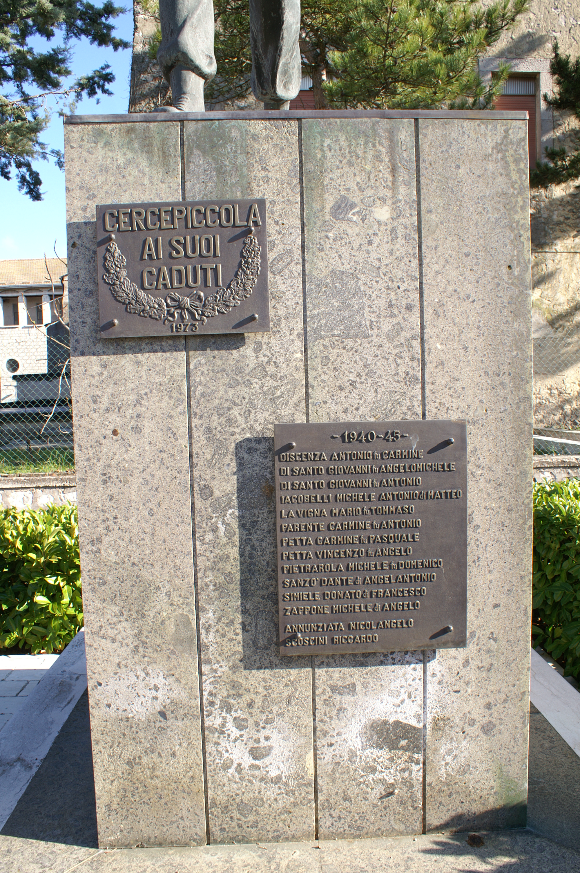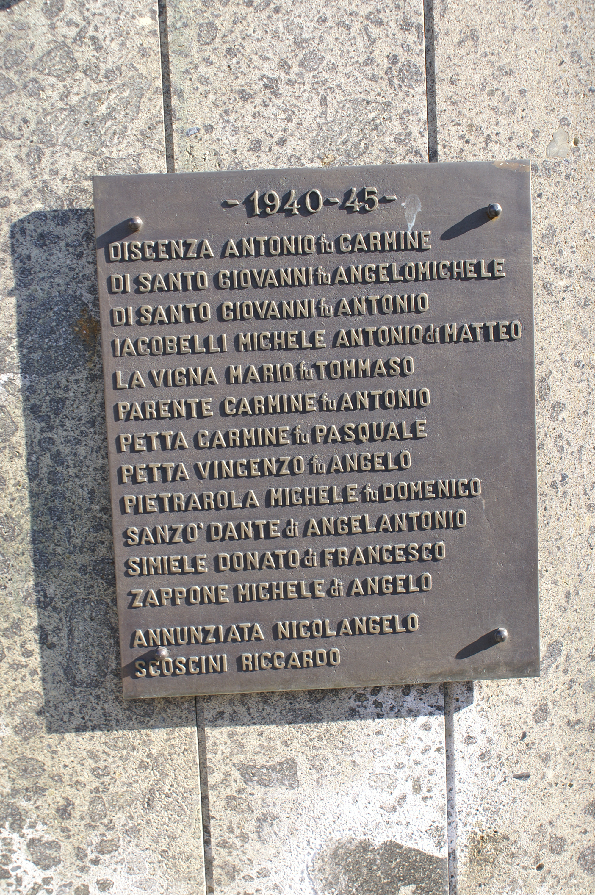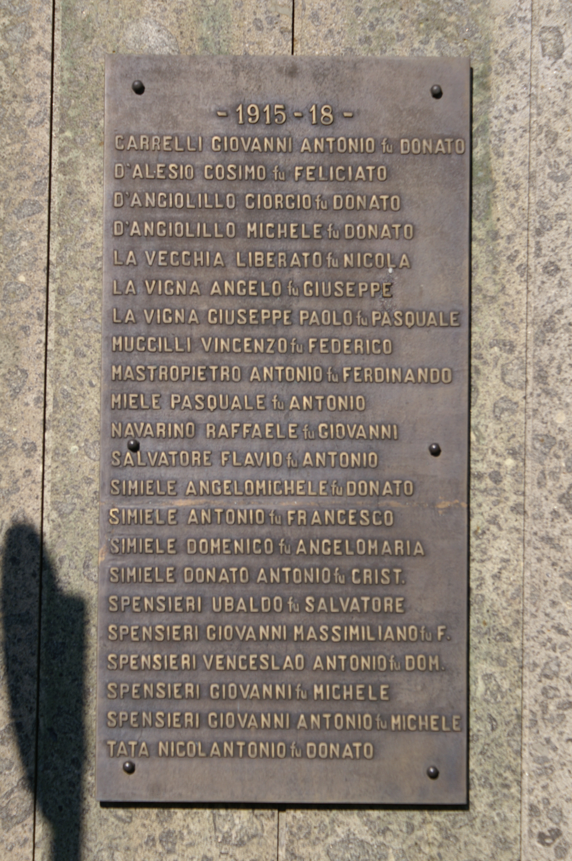 - ISCRIZIONI sulla lapide bronzea a destra del basamento - - 1915 - 18 -/CARRELLI GIOVANNI ANTONIO fu DONATO/D'ALESIO COSIMO fu FELICIATO/D'ANGIOLILLO GIORGIO fu DONATO/D'ANGIOLILLO MICHELE fu DONATO/LA VECCHIA LIBERATO fu NICOLA/LA VIGNA ANGELO fu GIUSEPPE/LA VIGNA GIUSEPPE PAOLO fu PASQUALE/MUCCILLI VINCENZO fu FEDERICO/MASTROPIETRO ANTONIO fu FERDINANDO/MIELE PASQUALE fu ANTONIO/NAVARRINO RAFFAELE fu GIOVANNI/SALVATORE FLAVIO fu ANTONIO/SIMIELE ANGELOMICHELE fu DONATO/SIMIELE ANTONIO fu FRANCESCO/SIMIELE DOMENICO fu ANGELOMARIA/SIMIELE DONATO ANTONIO fu CRIST./SPENSIERI UBALDO fu SALVATORE/SPENSIERI GIOVANNI MASSIMILIANO fu F./SPENSIERI VENCESLAO ANTONIO fu DOM./SPENSIERI GIOVANNI fu MICHELE/SPENSIERI GIOVANNI ANTONIO fu MICHELE/ TATA NICOLANTONIO fu DONATO - caratteri vari - a rilievo -