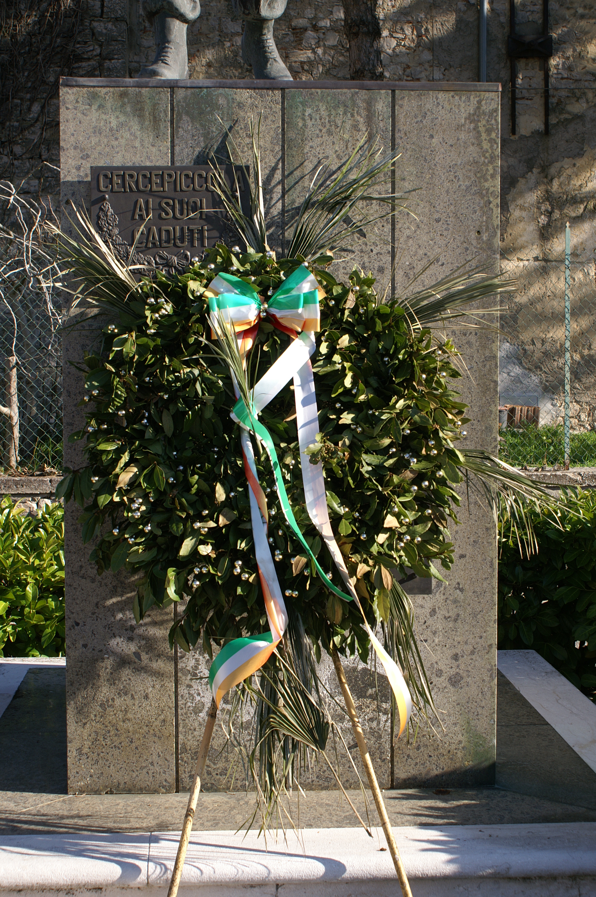 - NOTIZIE STORICO CRITICHE La lapide relativa ai caduti della prima guerra, posizionata sul lato destro del basamento, riporta gli stessi nominativi della lapide marmorea posta in via Lombardi (NCTN 1400080054) e l'aggiunta di pochi altri. La lapide della committenza e quella con i caduti della seconda guerra si trovano sul fronte strada, sulla parte anteriore del basamento marmoreo. La lapide della committenza presenta anche una decorazione vegetale, due rami uno di quercia e uno di alloro legati nella parte centrale da un nastro, che si ritrova anche nello stemma comunale