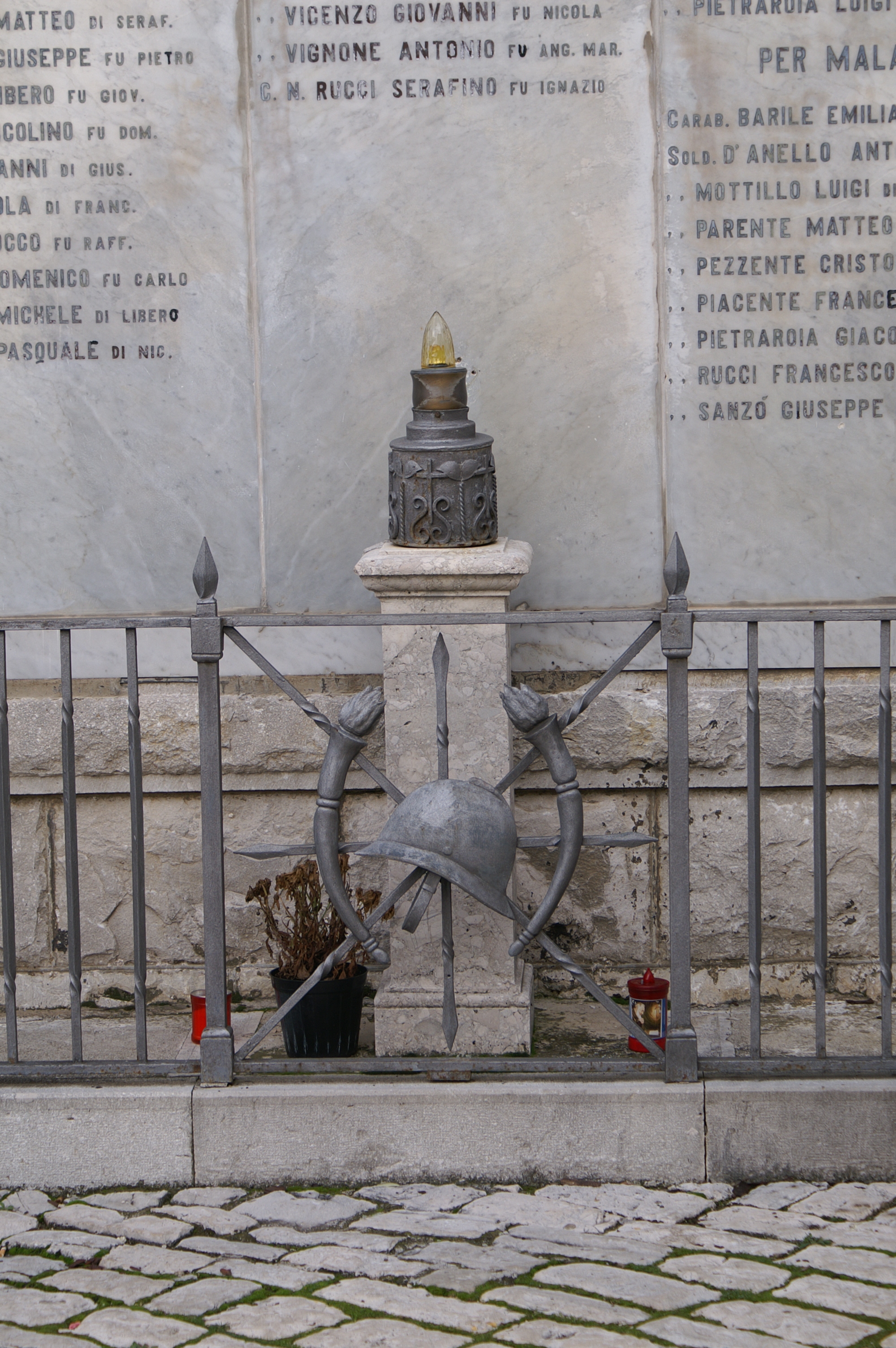 - NOTIZIE STORICO CRITICHE La cornice bronzea presenta nella parte superiore, racchiuso in un cartiglio lo stemma comunale; al di sotto decorazioni vegetali. La cornice bronzea inferiore è decorata con una serie di fiaccole a quattro fiammelle. La recinzione presenta una tripartizione del lato lungo; nel quadrato centrale è stato realizzato una elmo del primo conflitto racchiuso tra due fiaccole. Tra il recinto e il monumento è posta, su un basso piedistallo, la fiaccola bronzea risalente probabilmente agli anni venti del XX secolo