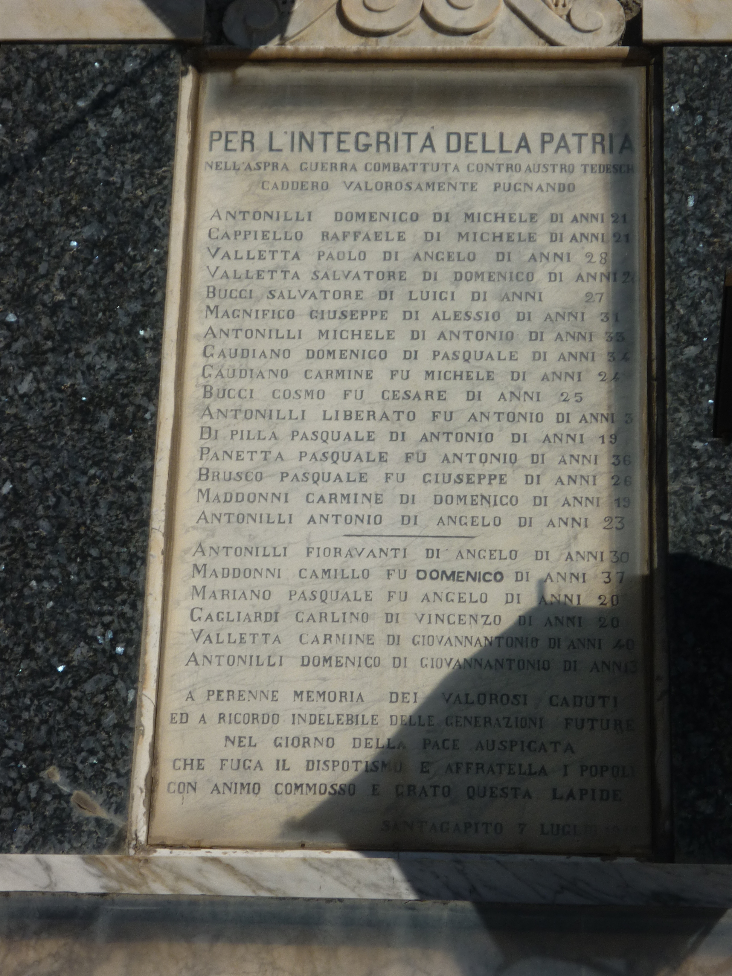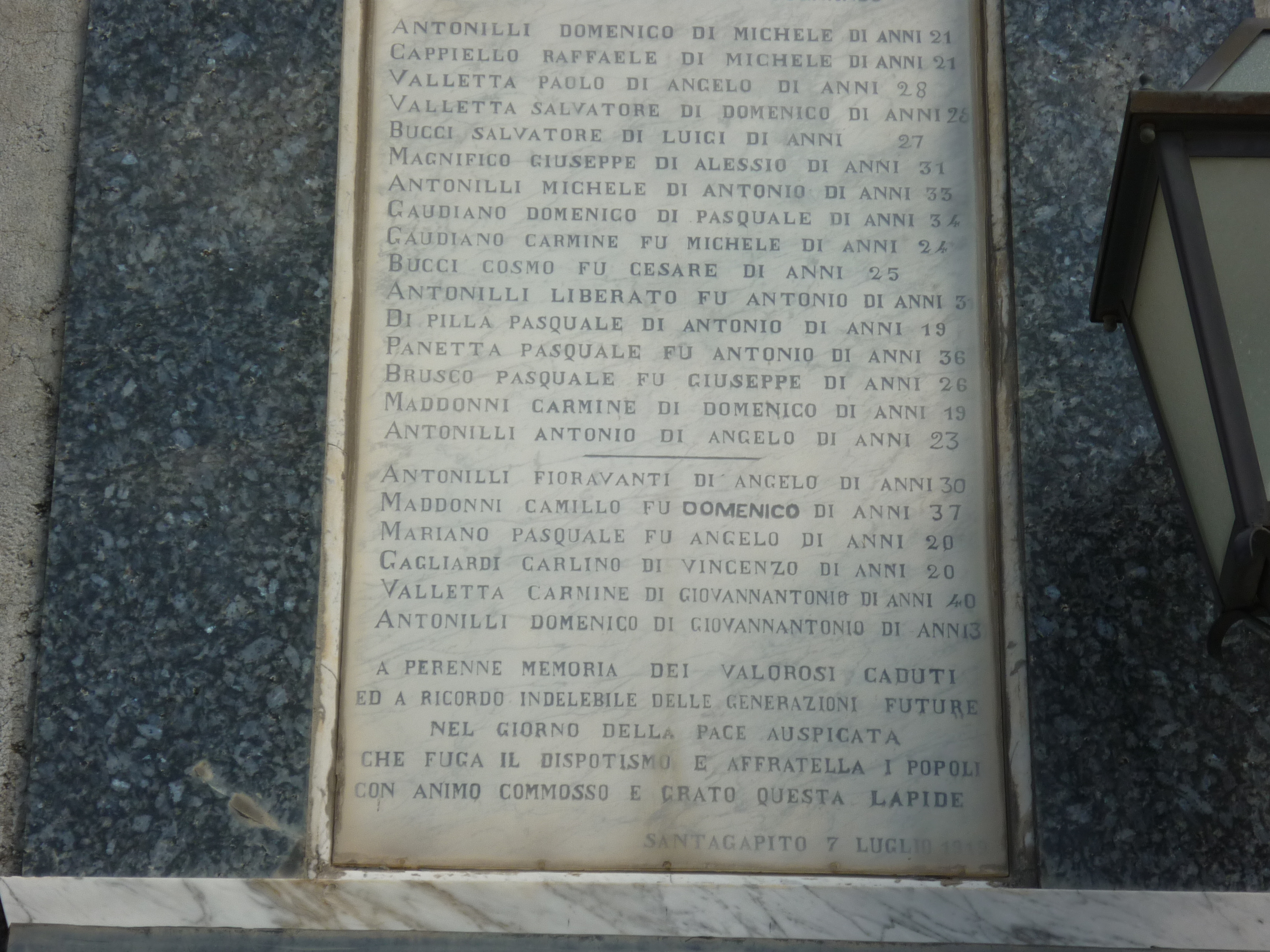 - ISCRIZIONI sull'intera superficie della lapide - PER L’INTEGRITA’ DELLA PATRIA \ NELL’ASPRA GUERRA COMBATTUTA CONTRO AUSTRO TEDESCHI \ CADDERO VALOROSAMENTE PUGNANDO \ ANTONILLI DOMENICO DI MICHELE DI ANNI 21 \ CAPPIELLO RAFFAELE DI MICHELE DI ANNI 21 \ VALLETTA PAOLO DI ANGELO DI ANNI 28 \ VALLETTA SALVATORE DI DOMENICO DI ANNI 25 \ BUCCI SALVATORE DI LUIGI DI ANNI 27 \ MAGNIFICO GIUSEPPE DI ALESSIO DI ANNI 31 \ ANTONILLI MICHELE DI ANTONIO DI ANNI 33 \ GAUDIANO DOMENICO DI PASQUALE DI ANNI 34 \ GAUDIANO CARMINE FU MICHELE DI ANNI 24 \ BUCCI COSMO FU CESARE DI ANNI 25 \ ANTONILLI LIBERATO FU ANTONIO DI ANNI 31 \ DI PILLA PASQUALE DI ANTONIO DI ANNI 19 \ PANETTA PASQUALE FU ANTONIO DI ANNI 36 \ BRUSCO PASQUALE FU GIUSEPPE DI ANNI 26 \ MADDONNI CARMINE DI DOMENICO DI ANNI 19 \ ANTONILLI ANTONIO DI ANGELO DI ANNI 23 \ ANTONILLI FIORAVANTI DI ANGELO DI ANNI 30 \ MADDONNI CAMILLO FU DOMENICO DI ANNI 37 \ MARIANO PASQUALE FU ANGELO DI ANNI 20 \ GAGLIARDI CARLINO DI VINCENZO DI ANNI 20 \ VALLETTA CARMINE DI GIOVANNANTONIO DI ANNI 3[…] \ A PERENNE MEMORIA DEI VALOROSI CADUTI \ ED A RICORDO INDELEBILE DELLE GENERAZIONI FUTURE \ NEL GIORNO DELLA PACE AUSPICATA \ CHE FUGA IL DISPOTISMO E AFFRATELLA I POPOLI \ CON ANIMO COMMOSSO E GRATO QUESTA LAPIDE \ SANTAGAPITO 7 LUGLIO 1919 - capitale - a incisione -