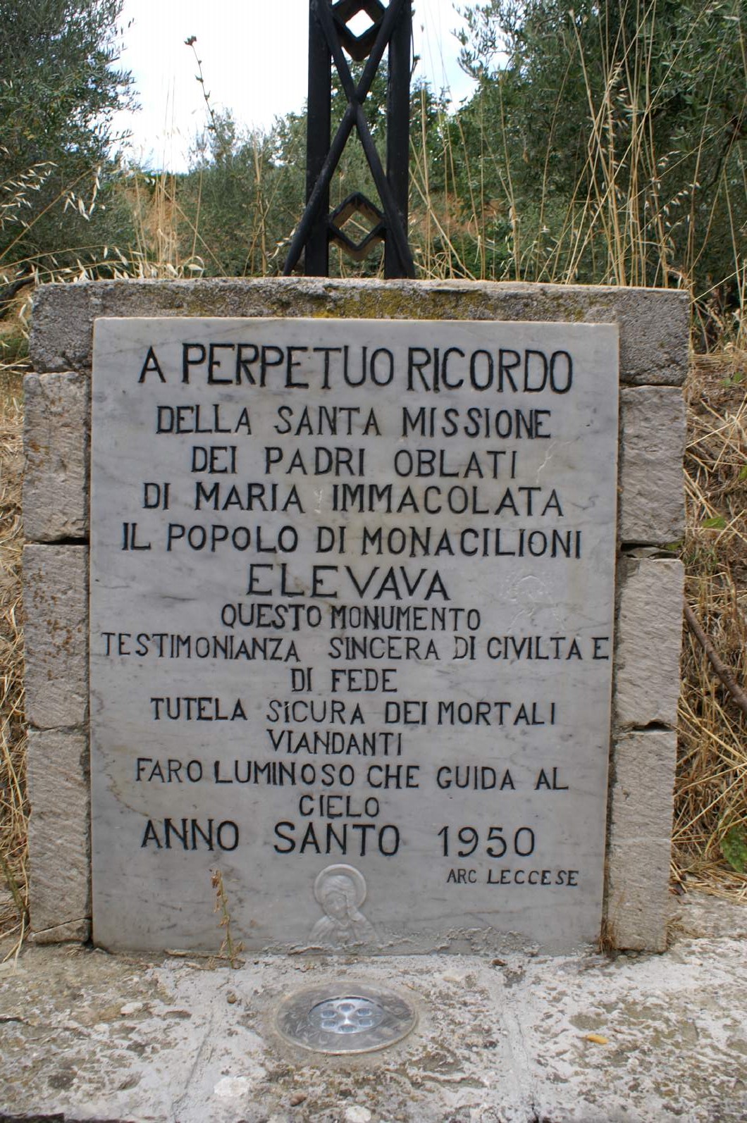 - ISCRIZIONI sul basamento - A PERPETO RICORDO / DELLA SANTA MISSIONE / DEI PADRI OBLATI / DI MARIA IMMACOLATA / IL POPOLO DI MONACILIONI / ELEVAVA / QUESTO MONUMENTO / TESTIMONIANZA SINCERA DI CIVILTA E / DI FEDE / TUTELA SICURA DEI MORTALI / VIANDANTI / FARO LUMINOSO CHE GUISA AL / CIELO / ANNO SANTO 1950 / ARCH LECCESE - caratteri vari -