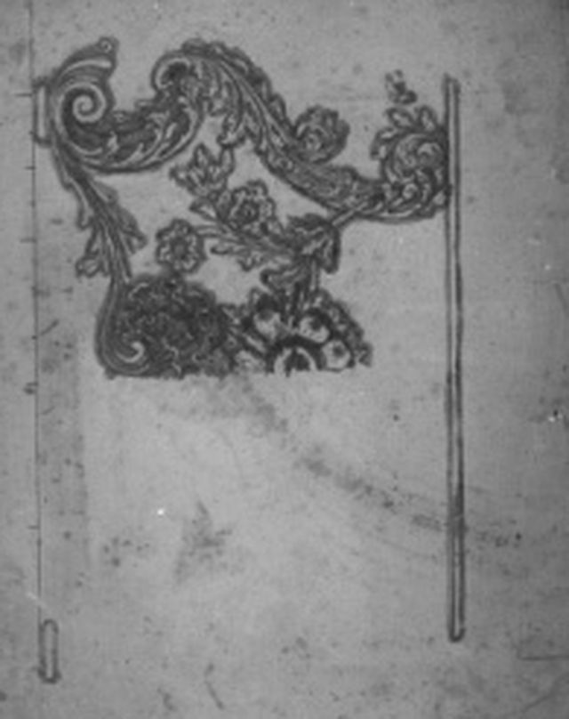 Il foglio è disegnato su entrambe le facce, sul recto: studio per angolare di volta con sistema di volute, mensole, cartocci e motivi floreali. In angolo in basso a destra è una testa decorativa. Da tale angolo si diparte una diagonale a penna che divide le due possibili varianti dell’angolo. Nell’angolo in alto a sinistra è una ampia zona circolare a 45 gradi, vuota, mentre nella parte superiore è un fregio a fascia. Sul verso: studio di elemento decorativo, probabile frontale di mobile sviluppato sul lato destro del foglio, in orizzontale. In alto una linea retta graduata, sotto la cui estremità sinistra è la mensola della metà non disegnata del mobile. Questo è composto da un bordo a volute mistilinee fitomorfe con diramazioni floreali che si dipartono dal piede. Sull’asse centrale sono sviluppate, sempre a metà, una grossa margherita in basso ed una complessa conchiglia in alto. Le parti sporgenti sono evidenziate da una bordatura a tempera. Il mobile poggia su un piano