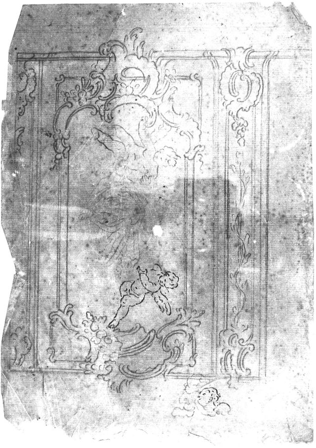 Il foglio è disegnato solo su una sola faccia: racchiusa tra due elementi verticali a parasta è una specchiera con ricche modanature asimmetriche nella parte inferiore e superiore. All’interno sono un putto alato in alto, ed un altro, sempre alato e toccato a penna, in basso. Nella parte bassa del foglio è una coppia di teste conali, una delle quali con tocchi a penna