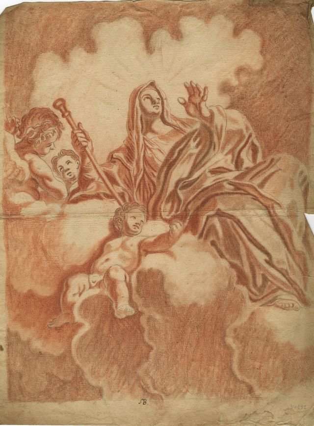 • NOTIZIE STORICO CRITICHE La raccolta, miscellanea di disegni, acquerelli, bozzetti, stampe etc. di vari artisti attivi nei secc. XVII e XVIII, fu recuperata nel 1983 presso le famiglie Iannadrea e Tirabassi, eredi dei Giuliani, Giacomo, padre, e Nicola, figlio, pittori e decoratori di Oratino (CB) operativi in ambito napoletano a cavallo dei secc. XIX-XX. Nicola, allievo di Morelli, la acquisì dagli eredi di Ciriaco Brunetti, pittore e decoratore oratinese attivo in tutto il Molise dalla prima metà del sec. XVIII agli inizi del XIX. Nel 1990 è stata acquistata dal MIBAC e custodita dalla locale Soprintendenza (specifiche dell’atto del 29/10/1990: 375 disegni su fogli singoli; un taccuino di 27 fogli, un taccuino di 21 fogli, un taccuino di 141 fogli, un volume rilegato contenente 54 fogli, 129 incisioni e 24 bozzetti ad olio su tela o cartone). Considerato che su un foglio sono stati realizzati più disegni-bozzetti-schizzi, il fondo è costituito da 700 disegni circa, di cui oltre la metà acquerellati, e da circa 330 stampe, italiane e tedesche, dei secc. XVI-XVIII. La collezione è composta da: disegni raccolti in n. 4 taccuini di Ciriaco Brunetti o Benedetto Brunetti, di varie dimensioni (n. 1 con figure di Santi e n. 3 con progetti per decorazioni); un album rilegato in pelle nel quale sono stati originariamente incollati circa 200 disegni di mani diverse (riportati a singoli foglio dopo il restauro). Vi sono inoltre: circa n. 200 studi per decorazioni in larga parte siglati o firmati da Ciriaco Brunetti; un gruppo di circa n. 70 accademie di nudo riconducibili alla bottega di Francesco Solimena; un gruppo di circa n. 30 disegni a soggetto sacro di Niccolò Falocco, pittore oratinese zio di Brunetti, allievo di Solimena, operativo a Napoli; n. 40 fogli di autori vari di ambito napoletano dei secc. XVI-XVIII (Balducci, Corenzio, Giaquinto etc.). L’importanza del fondo è data dalla sua unitarietà trattandosi di materiale di uso quotidiano, giunto quasi integro fino a noi, di un pittore gravitante in ambito provinciale, la cui produzione superstite è purtroppo oggi riconducibile solo ad una serie di dipinti, conservati in chiese molisane. Testimonia, inoltre, non solo la quotidiana, costante attività del Brunetti nell’ambito dei soggetti decorativi, ma anche l’operosa attività di una bottega oratinese in cui praticavano più esponenti dello stesso ambito familiare (Pietro, Beniamino, Benedetto e Stanislao Brunetti). Le opere, restaurate per oltre il 50% in tre fasi, dal 1992 al 1995 dai restauratori C. L. B. Borruso e P. Crisostomi, sono state custodite presso i depositi della Soprintendenza fino al 2015 anno di definitiva collocazione presso Castello Pandone di Venafro, dove, a rotazione, fanno parte dell’esposizione permanente del Museo. Il foglio è siglato da Stanislao Brunetti, fratello minore di Ciriaco, ha firmato gli affreschi dipinti sulle volte laterali della chiesa di Santa Maria di Loreto ad Oratino, con il fratello Ciriaco, nel 1757. L’analisi stilistica lo conferma autore anche del dipinto raffigurante la Madonna delle anime del Purgatorio della chiesa parrocchiale di Salcito che però ha firmato il fratello