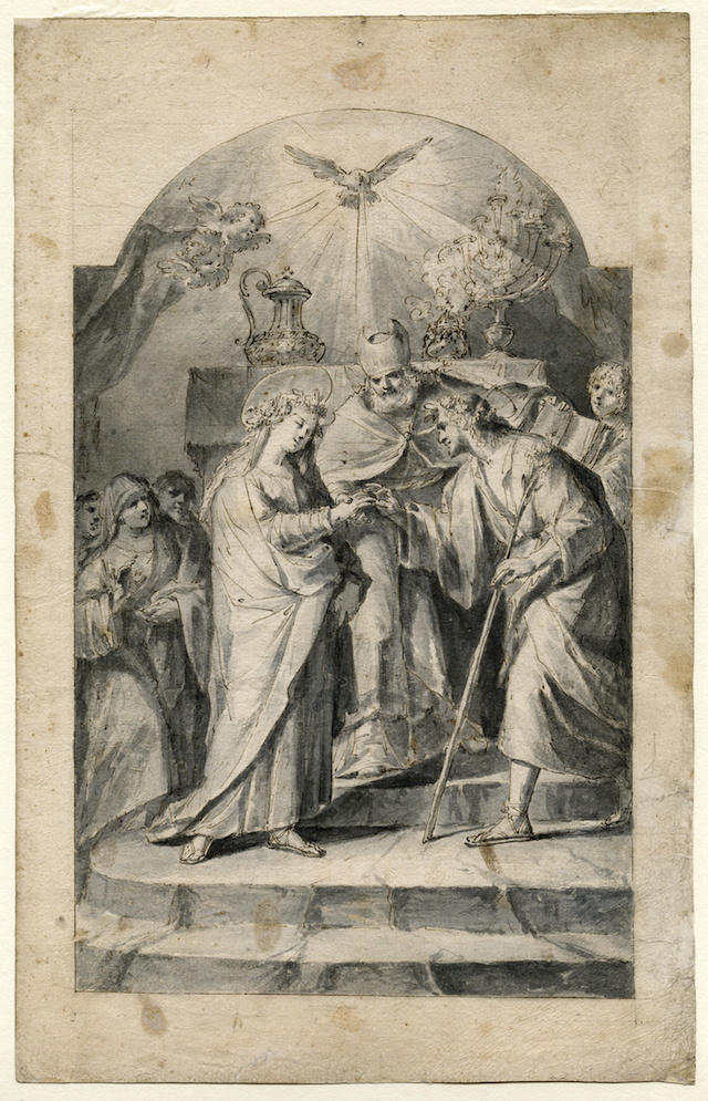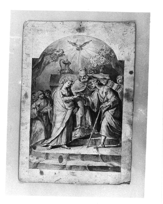 Sul recto del foglio studio per pala centinata con la Vergine a sinistra, San giuseppe a destra, il sacerdote in secondo piano che sorregge la mano di Maria fra astanti vari