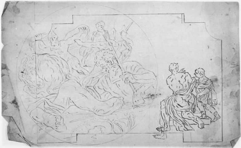 Il recto del foglio presenta un angolare di volta sviluppato in orizzontale; lungo la verticale sinistra del foglio e la base inferiore si sviluppa una complessa balaustra con coppe di mensole a supporto di vasi di fiori. Nell’angolare inferiore sinistro vi è la presenza di due angeli che reggono una cartella, al cui interno si scorge una bozza di paesaggio. Il verso presenta sulla sinistra cinque figure di combattenti, di cui alcuni a cavallo, circoscritti in un cerchio. Una complessa modanatura mistilinea incornicia il cerchio dei combattenti e sulla destra del foglio una coppia formata da un uomo a torso nudo inginocchiato e posto di spalle che è a colloquio con un bambino che sale dei gradini