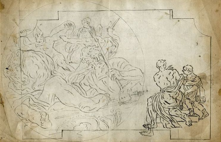 - NOTIZIE STORICO CRITICHE La raccolta, miscellanea di disegni, acquerelli, bozzetti, stampe etc. di vari artisti attivi nei secc.XVII e XVIII, fu recuperata nel 1983 presso le famiglie Iannadrea e Tirabassi, eredi dei Giuliani, Giacomo, padre, e Nicola, figlio, pittori e decoratori di Oratino (CB) operativi in ambito napoletano a cavallo dei secc. XIX-XX. Nicola, allievo di Morelli, la acquisì dagli eredi di Ciriaco Brunetti, pittore e decoratore oratinese attivo in tutto il Molise dalla prima metà del sec. XVIII agli inizi del XIX. Nel 1990 è stata acquistata dal MIBAC e custodita dalla locale Soprintendenza (specifiche dell’atto del 29/10/1990: 375 disegni su fogli singoli; un taccuino di 27 fogli, un taccuino di 21 fogli, un taccuino di 141 fogli, un volume rilegato contenente 54 fogli, 129 incisioni e 24 bozzetti ad olio su tela o cartone). Considerato che su un foglio sono stati realizzati più disegni-bozzetti-schizzi, il fondo è costituito da 700 disegni circa, di cui oltre la metà acquerellati, e da circa 330 stampe, italiane e tedesche, dei secc. XVI-XVIII. La collezione è composta da: disegni raccolti in n. 4 taccuini di Ciriaco Brunetti o Beniamino Brunetti, di varie dimensioni (n. 1 con figure di Santi e n. 3 con progetti per decorazioni); un album rilegato in pelle nel quale sono stati originariamente incollati circa 200 disegni di mani diverse (riportati a singoli foglio dopo il restauro). Vi sono inoltre: circa n. 200 studi per decorazioni in larga parte siglati o firmati da Ciriaco Brunetti; un gruppo di circa n. 70 accademie di nudo riconducibili alla bottega di Francesco Solimene; un gruppo di circa n. 30 disegni a soggetto sacro di Niccolò Falocco, pittore oratinese zio di Brunetti, allievo di Solimene, operativo a Napoli; n. 40 fogli di autori vari di ambito napoletano dei secc. XVI-XVIII (Balducci, Corenzio, Giaquinto etc.). L’importanza del fondo è data dalla sua unitarietà trattandosi di materiale di uso quotidiano, giunto quasi integro fino a noi, di un pittore gravitante in ambito provinciale, la cui produzione superstite è purtroppo oggi riconducibile solo ad una serie di dipinti, conservati in chiese molisane. Testimonia, inoltre, non solo la quotidiana, costante attività del Brunetti nell’ambito dei soggetti decorativi, ma anche l’operosa attività di una bottega oratinese in cui praticavano più esponenti dello stesso ambito familiare (Pietro, Beniamino, Benedetto e Stanislao Brunetti). Le opere, restaurate per oltre il 50% in tre fasi, dal 1992 al 1995 dai restauratori C. L. B. Borruso e P. Crisostomi, sono state custodite presso i depositi della Soprintendenza fino al 2010 anno di definitiva collocazione presso Castello Pandone di Venafro, dove, a rotazione, fanno parte dell’esposizione permanente del Museo. Il foglio presenta disegni sia sul recto sia sul verso con studi di architetture e di figure umane