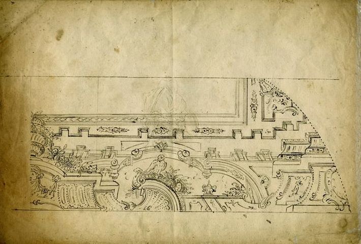 - NOTIZIE STORICO CRITICHE La raccolta, miscellanea di disegni, acquerelli, bozzetti, stampe etc. di vari artisti attivi nei secc.XVII e XVIII, fu recuperata nel 1983 presso le famiglie Iannadrea e Tirabassi, eredi dei Giuliani, Giacomo, padre, e Nicola, figlio, pittori e decoratori di Oratino (CB) operativi in ambito napoletano a cavallo dei secc. XIX-XX. Nicola, allievo di Morelli, la acquisì dagli eredi di Ciriaco Brunetti, pittore e decoratore oratinese attivo in tutto il Molise dalla prima metà del sec. XVIII agli inizi del XIX. Nel 1990 è stata acquistata dal MIBAC e custodita dalla locale Soprintendenza (specifiche dell’atto del 29/10/1990: 375 disegni su fogli singoli; un taccuino di 27 fogli, un taccuino di 21 fogli, un taccuino di 141 fogli, un volume rilegato contenente 54 fogli, 129 incisioni e 24 bozzetti ad olio su tela o cartone). Considerato che su un foglio sono stati realizzati più disegni-bozzetti-schizzi, il fondo è costituito da 700 disegni circa, di cui oltre la metà acquerellati, e da circa 330 stampe, italiane e tedesche, dei secc. XVI-XVIII. La collezione è composta da: disegni raccolti in n. 4 taccuini di Ciriaco Brunetti o Beniamino Brunetti, di varie dimensioni (n. 1 con figure di Santi e n. 3 con progetti per decorazioni); un album rilegato in pelle nel quale sono stati originariamente incollati circa 200 disegni di mani diverse (riportati a singoli foglio dopo il restauro). Vi sono inoltre: circa n. 200 studi per decorazioni in larga parte siglati o firmati da Ciriaco Brunetti; un gruppo di circa n. 70 accademie di nudo riconducibili alla bottega di Francesco Solimene; un gruppo di circa n. 30 disegni a soggetto sacro di Niccolò Falocco, pittore oratinese zio di Brunetti, allievo di Solimene, operativo a Napoli; n. 40 fogli di autori vari di ambito napoletano dei secc. XVI-XVIII (Balducci, Corenzio, Giaquinto etc.). L’importanza del fondo è data dalla sua unitarietà trattandosi di materiale di uso quotidiano, giunto quasi integro fino a noi, di un pittore gravitante in ambito provinciale, la cui produzione superstite è purtroppo oggi riconducibile solo ad una serie di dipinti, conservati in chiese molisane. Testimonia, inoltre, non solo la quotidiana, costante attività del Brunetti nell’ambito dei soggetti decorativi, ma anche l’operosa attività di una bottega oratinese in cui praticavano più esponenti dello stesso ambito familiare (Pietro, Beniamino, Benedetto e Stanislao Brunetti). Le opere, restaurate per oltre il 50% in tre fasi, dal 1992 al 1995 dai restauratori C. L. B. Borruso e P. Crisostomi, sono state custodite presso i depositi della Soprintendenza fino al 2010 anno di definitiva collocazione presso Castello Pandone di Venafro, dove, a rotazione, fanno parte dell’esposizione permanente del Museo. Il foglio presenta sia sul recto sia sul verso studi dell’artista Ciriaco Brunetti. Il recto è siglato con il monogramma dell’artista, che si trova anche in altri disegni della collezione Giuliani; il motivo a rocaille, qui realizzato, è a lui caro, tanto che lo utilizzò anche nella decorazione pittorica della chiesa di Santa Maria di Loreto ad Oratino nel 1757. Sul verso si intravede la sagoma della figura della Superbia, a causa del passaggio dell’inchiostro
