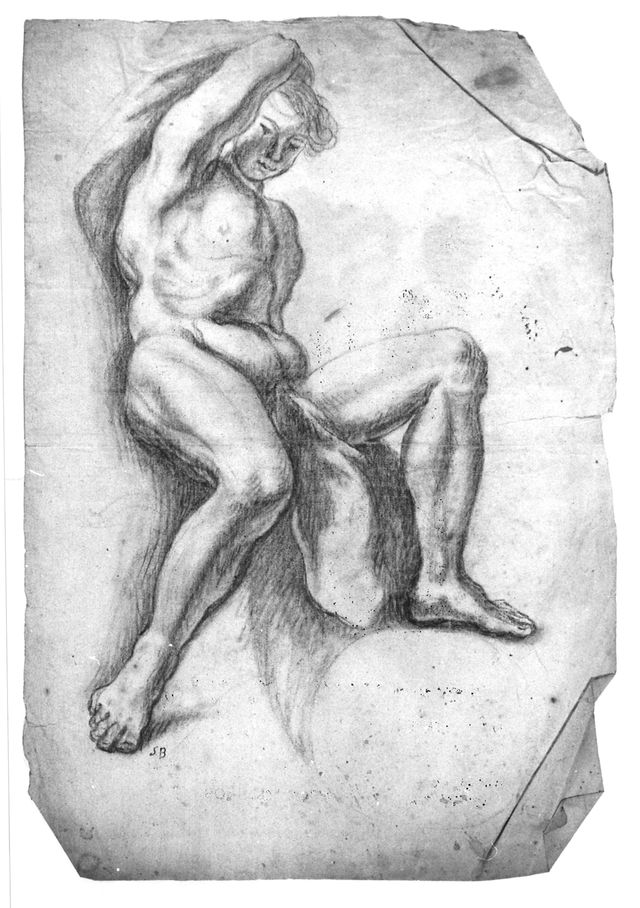 - NOTIZIE STORICO CRITICHE La raccolta, miscellanea di disegni, acquerelli, bozzetti, stampe etc. di vari artisti attivi nei secc. XVII e XVIII, fu recuperata nel 1983 presso le famiglie Iannadrea e Tirabassi, eredi dei Giuliani, Giacomo, padre, e Nicola, figlio, pittori e decoratori di Oratino (CB) operativi in ambito napoletano a cavallo dei secc. XIX-XX. Nicola, allievo di Domenico Morelli, la acquisì dagli eredi di Ciriaco Brunetti, pittore e decoratore oratinese attivo in tutto il Molise dalla prima metà del sec. XVIII agli inizi del XIX. Nel 1990 è stata acquistata dal MIBAC e custodita dalla locale Soprintendenza (specifiche dell’atto del 29/10/1990: 375 disegni su fogli singoli; un taccuino di 27 fogli, un taccuino di 21 fogli, un taccuino di 141 fogli, un volume rilegato contenente 54 fogli, 129 incisioni e 24 bozzetti ad olio su tela o cartone). Considerato che su un foglio sono stati realizzati più disegni-bozzetti-schizzi, il fondo è costituito da 700 disegni circa, di cui oltre la metà acquerellati, e da circa 330 stampe, italiane e tedesche, dei secc. XVI-XVIII. La collezione è composta da: disegni raccolti in n. 4 taccuini di Ciriaco Brunetti o Beniamino Brunetti, di varie dimensioni (n. 1 con figure di Santi e n. 3 con progetti per decorazioni); un album rilegato in pelle nel quale sono stati originariamente incollati circa 200 disegni di mani diverse (riportati a singoli foglio dopo il restauro). Vi sono inoltre: circa n. 200 studi per decorazioni in larga parte siglati o firmati da Ciriaco Brunetti; un gruppo di circa n. 70 accademie di nudo riconducibili alla bottega di Francesco Solimena; un gruppo di circa n. 30 disegni a soggetto sacro di Niccolò Falocco, pittore oratinese zio di Brunetti, allievo di Solimena, operativo a Napoli; n. 40 fogli di autori vari di ambito napoletano dei secc. XVI-XVIII (Balducci, Corenzio, Giaquinto etc.). L’importanza del fondo è data dalla sua unitarietà trattandosi di materiale di uso quotidiano, giunto quasi integro fino a noi, di un pittore gravitante in ambito provinciale, la cui produzione superstite è purtroppo oggi riconducibile solo ad una serie di dipinti, conservati in chiese molisane. Testimonia, inoltre, non solo la quotidiana, costante attività del Brunetti nell’ambito dei soggetti decorativi, ma anche l’operosa attività di una bottega oratinese in cui praticavano più esponenti dello stesso ambito familiare (Pietro, Beniamino, Benedetto e Stanislao Brunetti). Le opere, restaurate per oltre il 50% in tre fasi, dal 1992 al 1995 dai restauratori C. L. B. Borruso e P. Crisostomi, sono state custodite presso i depositi della Soprintendenza fino al 2015 anno di definitiva collocazione presso Castello Pandone di Venafro, dove, a rotazione, fanno parte dell’esposizione permanente del Museo. La quasi totalità dei gruppi di nudi della collezione Giuliani (schede di catalogo n. 1400081066, 1400081067 e da 14/00080782 a 1400080835) è stilisticamente riferibile a Ciriaco Brunetti, ma in questo caso le cifre SB, permettono di legare il foglio al fratello minore dell’artista, Stanislao. La sigla dell’autore è posizionata vicino al piede destro del nudo maschile. Il foglio è stato utilizzato parzialmente nel verso, in cui è raffigurato San Francesco in preghiera sulla facciata destra. Le tecniche utilizzate per i due disegni sono differenti, carboncino per il nudo e sanguigna per l’immagine sacra. Il supporto presenta pieghe e grinze negli angoli