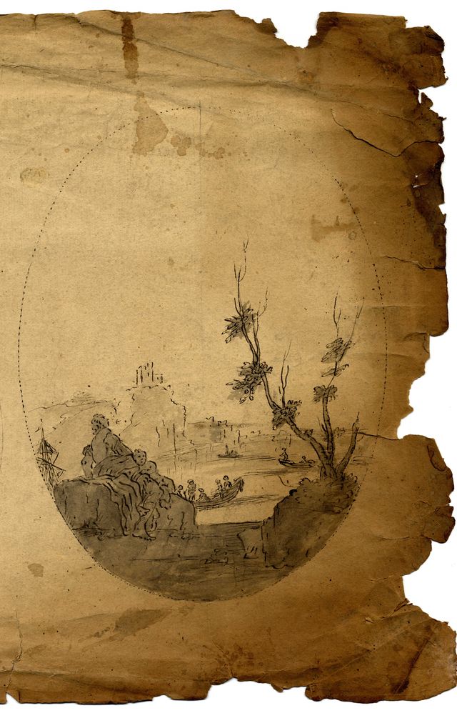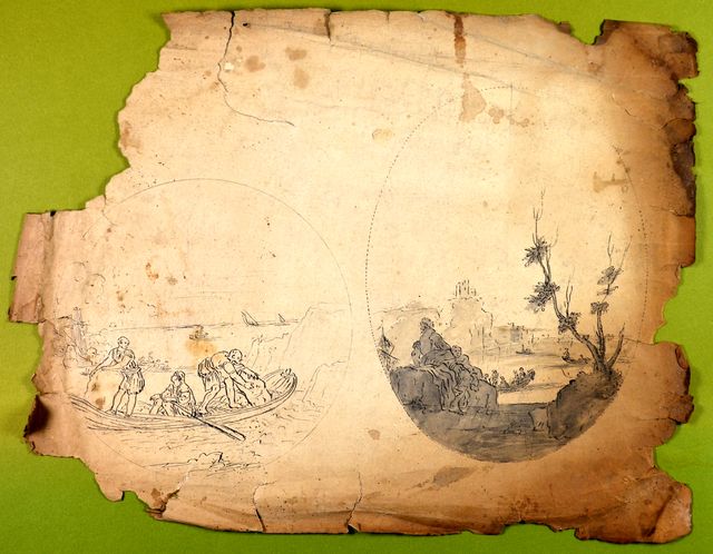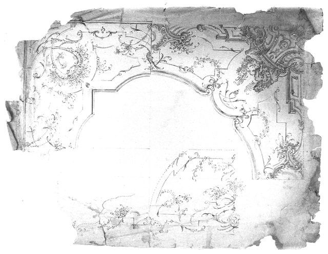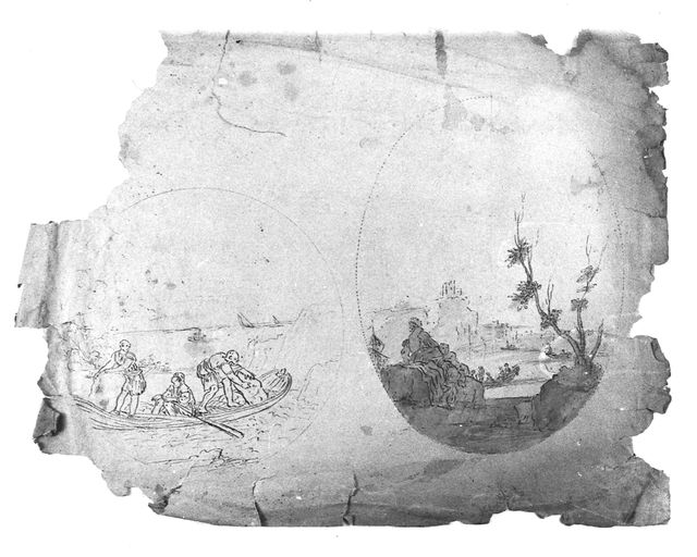 Il disegno presente sul recto è una sezione laterale con timpano, su cui seggono due satiri; Il verso pressenta due paesaggi racchiusi in tondo e ovale