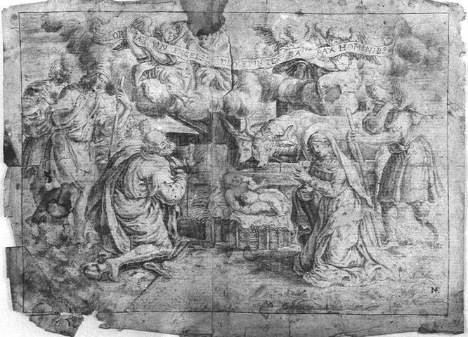 Il foglio è disegnato solo sul recto: delimitato da un rettangolo, al centro S. Giuseppe e la Vergine inginocchiati adorano il Bambino posato nella mangiatoia, in secondo piano l’asino ed il bue dietro un tavolato. Ai lati, due pastori a sinistra, ed uno a destra con un agnello sulle spalle; in alto gloria di angeli tra nubi