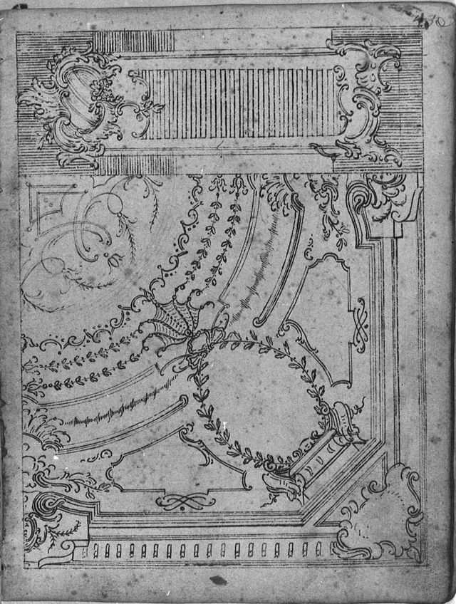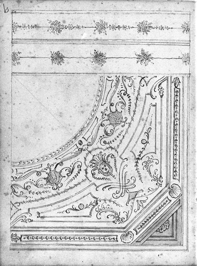 Il foglio di taccuino è disegnato su entrambi i lati. Recto: disegno di angolare di volta in campo quadrato con cornicione ornato da cartocci, specchiature mistilinee che inquadrano un motivo ad ellisse incornicaito da un sert; versoil centro una serie di fasce cencentriche alternano motivi fogliacei a motivi geometrici. In alto fascia decorativa con specchiatura inquadrata da motivi rocaille. Verso: disegno di angolare di volta in campo quadrato con incorniciatura lineare ornata da motivo fogliaceo. Verso il centro mascarella inquadrata da specchiature mistilinee e sormontata da fascia con motivi a ragnatela. In alto fascia orizzontale con motivi floreali