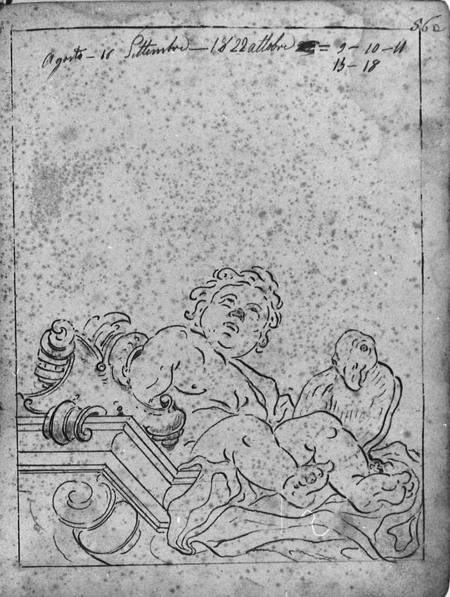 Il foglio di taccuino è disegnato su entrambi i lati. Recto: putto seduto su una balaustra con un pappagallo a fianco. Verso: due cornici ovali tratteggiate inquadrano due figure maschili in piedi su massi, avvolte da drappi