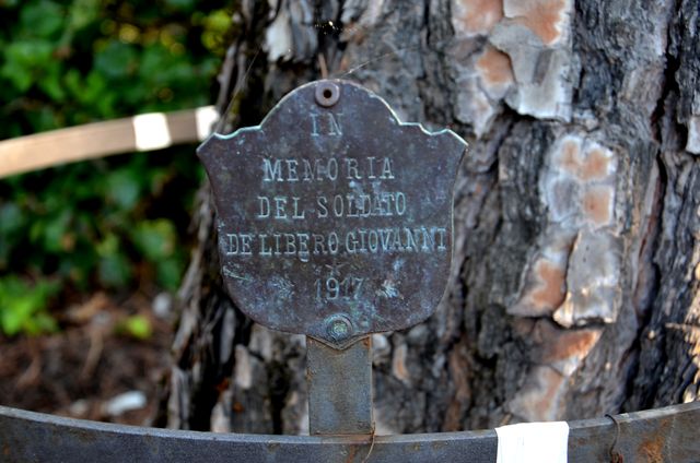 - NOTIZIE STORICO CRITICHE Il Viale delle Rimembranze di Campobasso fu realizzato da Renato Pistilli Sipio, che ricoprì il ruolo di tenente medico nel primo conflitto mondiale, nominato podestà della città nel 1926-1927 e nel 1935-1938. Progettò l'opera e la fece realizzare durante il suo primo mandato per commemorare i giovani molisani tragicamente deceduti caduti durante la Grande Guerra, e tra questi i suoi tre fratelli Carlo, Silvio e Angiolo. Inaugurato già dal Ministro della Pubblica Istruzione Giovanni Gentile il 26/01/1924 il viale è lungo 250 m e si snoda con ben 134 pini posti in doppia fila. Le piantagioni vennero fornite dalla ditta Vincenzo Di Lauro di Campobasso mentre fu l'artigiano Michele di Toro a realizzare tra il 1927-30 le targhe cesellate a mano, poste ai piedi di ogni albero, con incisa la dedica a ciascun soldato. La Ditta di De Capoa Enrico fornì la lampada votiva posta all'inizio del percorso. Questa targa riportata anche nell'elenco-ubicazione del 1944, è dedicata a De Libero Giovanni, figlio di Giuseppantonio, caporale del 260° reggimento fanteria nato a Campobasso il 10/02/1889 e diesperso all'età di 28 anni, il 24/08/1917 sulla quota 145 in combattimento