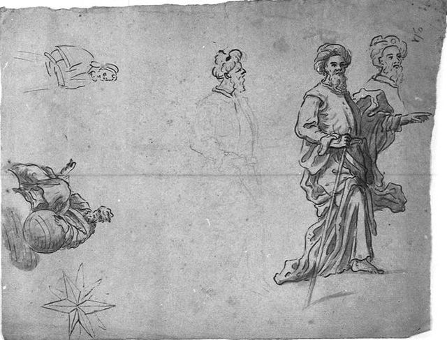Il foglio presenta disegni sul recto con un abbozzo di elementi fantastici; sul verso studi di figure e raffigurazione del Padre Eterno. Le figure maschili laterali risultano solo abbozzate, mentre quella centrale è terminata
