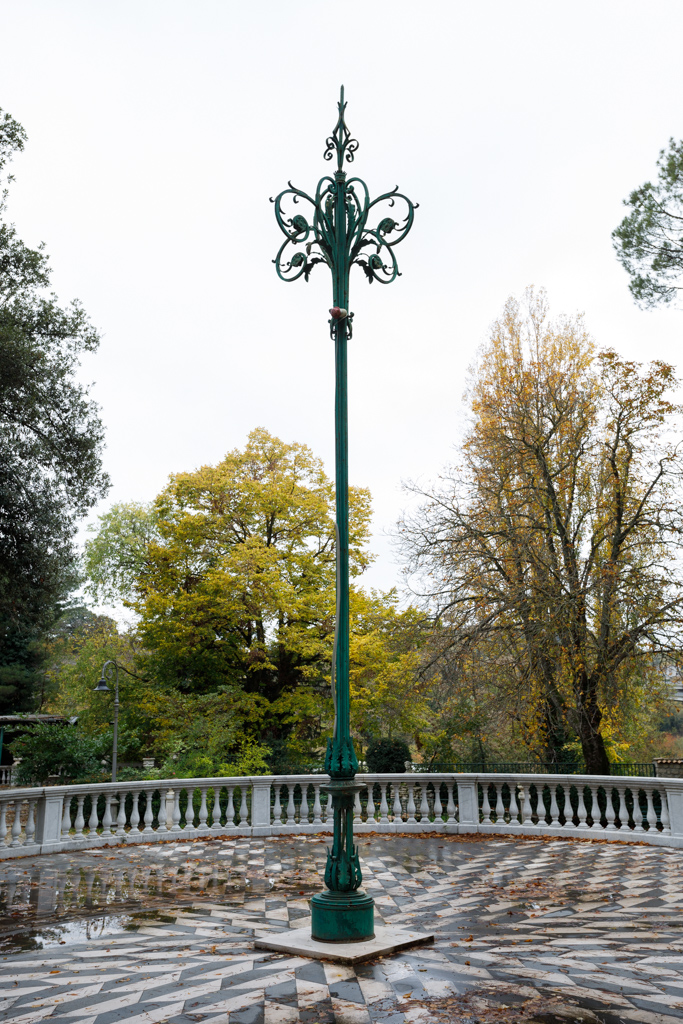 - NOTIZIE STORICO CRITICHE Il lampione è posto al centro del piazzale posto al centro della villa, al termine del viale centrale, definito da una balaustra in pietra e da una pavimentazione a rombi bicolori. Si tratta del cuore del grande parco comunale, sorto nel luogo in origine destinato a fungere da orto botanico del convento francescano di Santa Maria delle Grazie, passato poi alla proprietà privata della famiglia De Capoa ed infine acquisito, nel 1929, dal Comune di Campobasso. La risistemazione dell’area verde, tra la fine degli anni Venti e gli anni Trenta del XX secolo, ebbe come protagonista la bottega della famiglia Tucci, maestri ferrari in Campobasso, e in particolare Giuseppe, il cugino Salvatore e il figlio Nicola. In questo caso, secondo le fonti, fu proprio Salvatore l’artefice del lampione in ferro battuto, dalla linea elegante e pulita, con minor carico decorativo, senza nulla perdere, tuttavia, in qualità formale e tecnica. Allo stesso Salvatore si attribuisce anche l’ideazione della balaustra che delimita il piazzale