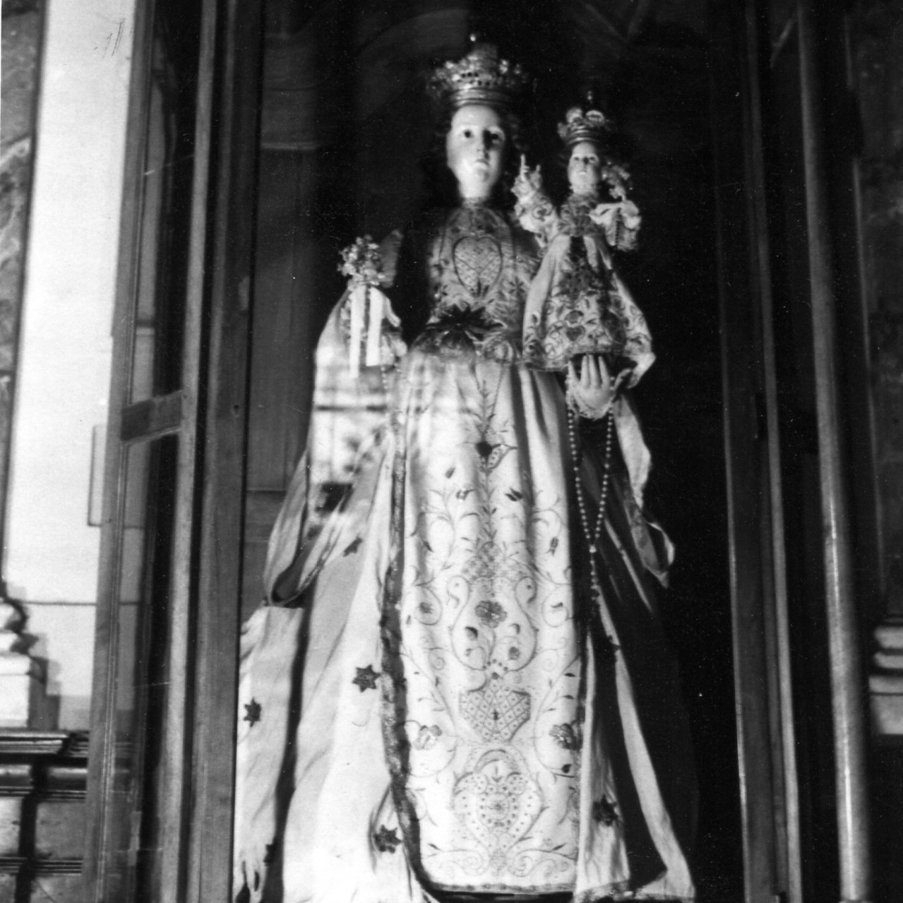 - NOTIZIE STORICO CRITICHE E' la tipica statua del '700 napoletano (con occhi di vetro e parrucca riccioluta di seta naturale). Questa statua era conservata nella chiesa di S. Sebastiano, adiacente alla Congregazione del SS. Rosario; per essa nel 1799 fu allestita una nicchia con elegante e ricca cornice in marmi policromi (vedere relativa scheda della chiesa di S. Sebastiano)