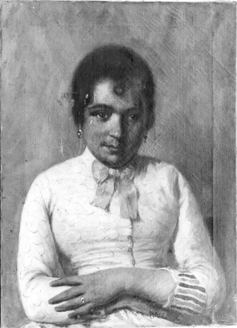 Ragazza raffigurata a mezzo busto, dal colorito scuro. Indossa un vestito bianco con un fiocco rosa al collo; tiene le braccia conserte ed un anello al dito. La tela è montata su di una cornice dorata ed intagliata