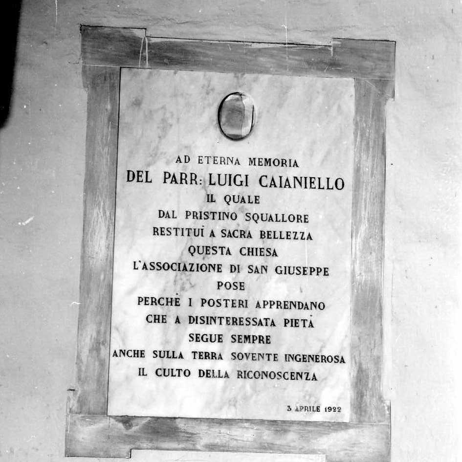 - ISCRIZIONI AD ETERNA MEMORIA/ DEL PARR. LUIGI CAIANIELLO/ IL QUALE/ DAL PRISTINO SQUALLORE/ RESTITUì A SACRA BELLEZZA/ QUESTA CHIESA/ L'ASSOCIAZIONE DI SAN GIUSEPPE/ POSE/ PERCHE' I POSTERI APPRENDANO/ CHE A DISINTERESSATA PIETA'/ SEGUE SEMPRE/ ANCHE SULLA TERRA SOVENTE INGENEROSA/ IL CULTO DELLA RICONOSCENZA/ 3 APRILE 1922 - nel campo - lettere capitali - a incisione -