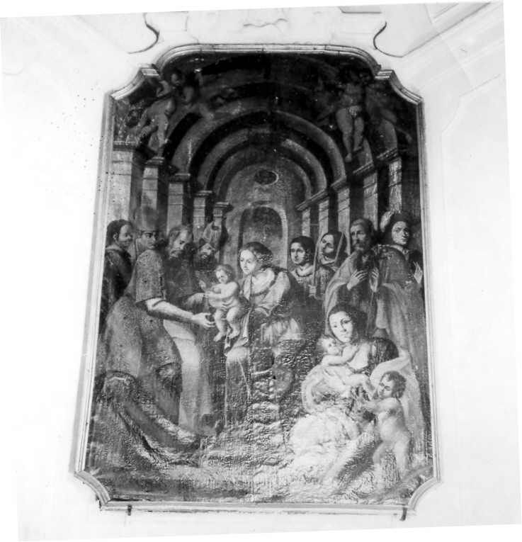 - NOTIZIE STORICO CRITICHE La tela restaurata nel 1972 ha rivelato dei particolari nuovi e una gamma di colori più vivi di quanto apparissero precedentemente, ma è troppo manomessa perchè si possa fare un'attribuzione precisa. Nel complesso essa appare frutto di un gusto molto provinciale ed ingenuo, evidente nella studiata simmetria dei due gruppi di figure ai lati della vergine e nella pesante accentuazione della fuga prospettica degli archi. Del tutto fuori dal contesto è la figura di donna in primo piano, che fa pensare ad una mano diversa. Lo stemma in basso è, forse, quello del committente. Prima del restauro era posta sul secondo altare a sinistra che ora è privo di pala