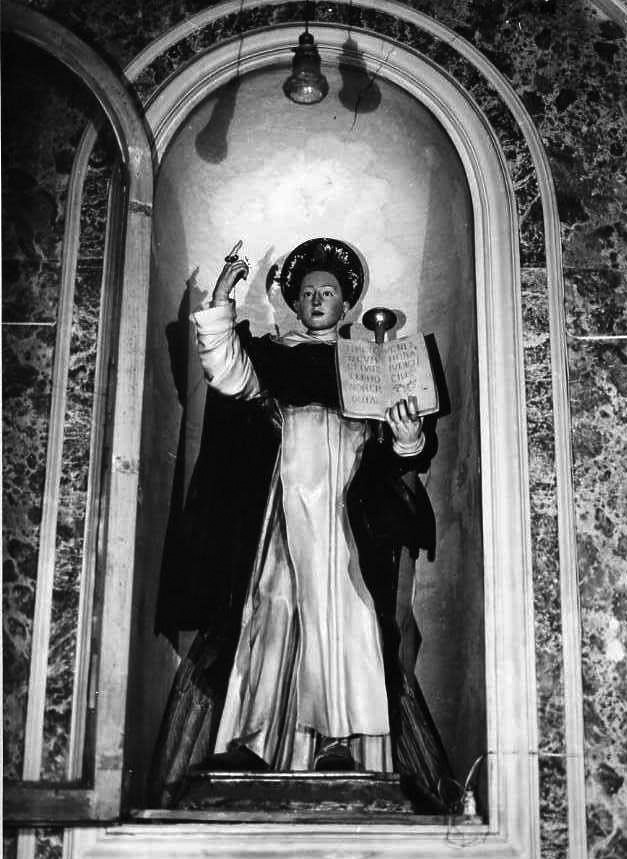 - NOTIZIE STORICO CRITICHE La scultura presenta un buon livello artistico; è articolata in piani plastici vibranti ed in vivace movimento. Il tipo di panneggio, tagliato a falde mosse e di gusto pittorico e la stessa elegante impostazione dell'immagine rimandano all'opera nota di artisti attivi fra Seicento e Settecento a Napoli, in particolare a Giacomo Colombo. Questi ebbe una numerosa scuola ed è a qualcuno dei suoi allievi che mi pare si possa riferire la statua. Secondo il De Sivo la scultura era stata realizzata per la Chiesa dell'Annunziata e nel corso dell'Ottocento trasferita nella sede attuale