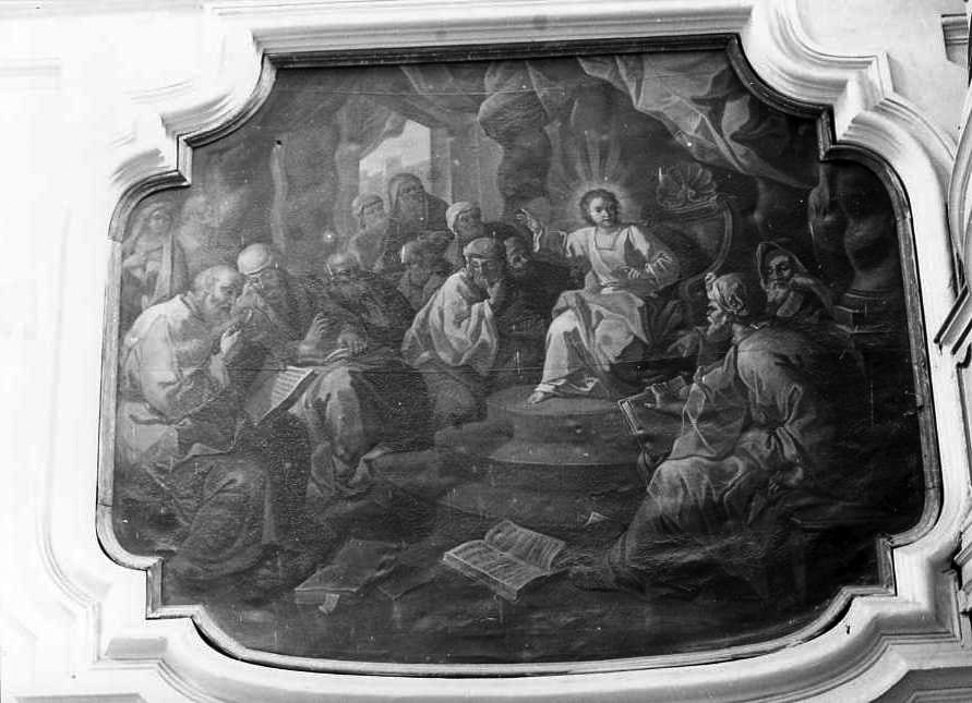 Il dipinto, di forma mistilinea, rappresenta Gesù in trono, sulla destra, mentre intorno a lui i dottori, siedono ai piedi della scala