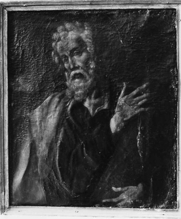 Il Santo, a mezza figura, regge con entrambe le mani la croce poggiandola sulla spalla sinistra. Tra le dita della destra, regge un pesce appeso ad una cordicella
