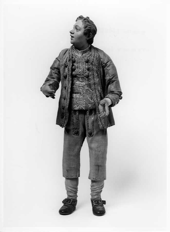 Giovane con testa in terracotta policroma, occhi in vetro, mani e piedi in legno, manichino in fil di ferro ricoperto di stoppa. Indossa una giacca rossa bordata in oro, dei pantaloni in seta verde con alamari in oro