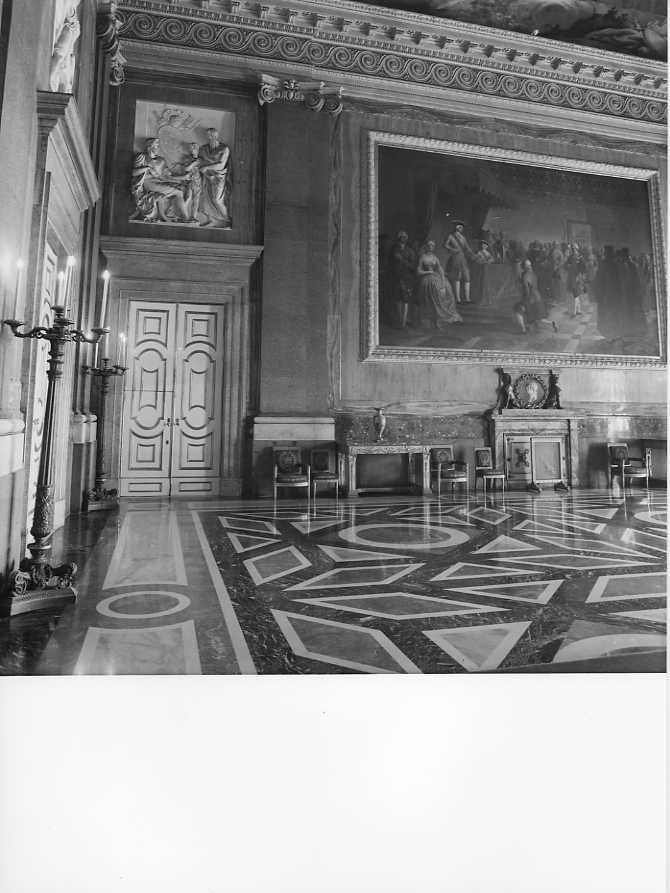 - NOTIZIE STORICO CRITICHE Le vicende decorative del salone ebbero un tormentato decorso già dalla fine del sec. XVIII per i continui ripensamenti progetturali e soprattutto per le alterne vicende politiche, che hanno reso la sala l'ambiente che ha maggiormente risentito di tali vicende e dei mutamenti di gusto ad esse relative. Luigi Vanvitelli aveva previsto l'affidamento dell'intera decorazione a Fedele Fischetti. Il figlio Carlo nel 1804 sovvertendo l'originario progetto aveva previsto al di sopra delle porte sei rilievi con episodi della vita di Alessandro Magno. Nel 1812 con Murat i soggetti vennero modificati con storie della vita delo stesso Gioacchino Murat. Con la restaurazione borbonica i pannelli con l'apologia murattiana vennero distrutti e al loro posto furono commissionati sei dipinti a monocromo con storie di Alessandro ultimati nel 1830 da Luigi Angelini, Camillo Guerra e Crescenzio Fattore. Nel 1845 i sei monocromi furono ulteriormente sostituiti per volere di Ferdinando II con sei rilievi con storie di Alessandro eseguite da Tito Angelini e Gennaro Calì e fu dipinto il finto tendaggio sull'architrave del balcone. Analogo destino toccò alle due opere che decorano le pareti laterali per le quali in epoca francese furono chiamati i pittori Schmidt e Suhlandt ad eseguire "La Capitolazione di Capri" e "La Battaglia d' Eylan". Con la Restaurazione i dipinti francesi furono sostituiti dalle opere di Gennaro Maldarelli e Camillo Guerra