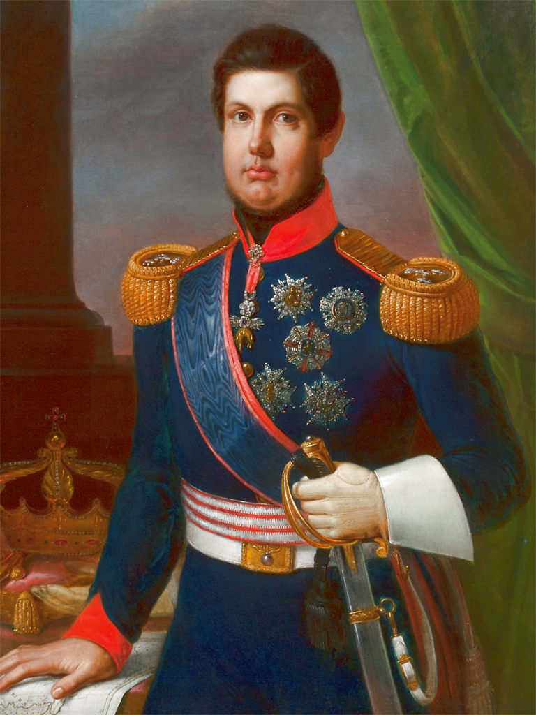 Il dipinto raffigura Ferdinando II, dall'espressione severa, con la consueta alta uniforme militare, galloni sullle spalle e medaglie sul petto; la mano destra ferma su delle carte geografiche poste su un tavolo e, appena arretrata, la corona. La mano sinistra impugna la spada